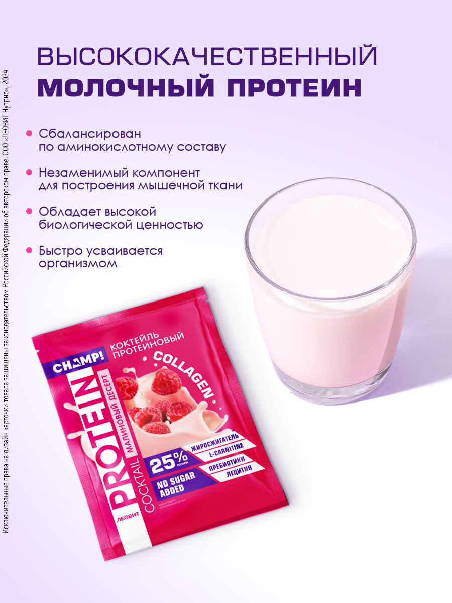 Коктейль протеиновый малиновый 5 шт по 30 гр без сахара Champ! от ЛЕОВИТ 25% белка быстрого приготовления в пакетиках