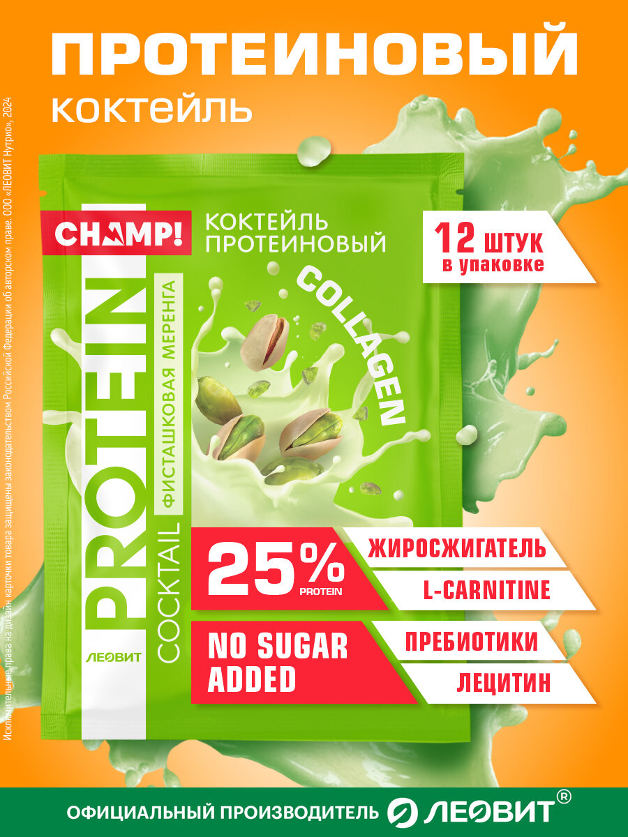 Купить Коктейль протеиновый фисташковый 12 шт по 30 гр без сахара Champ! от ЛЕОВИТ 25% белка быстрого приготовления в пакетиках
