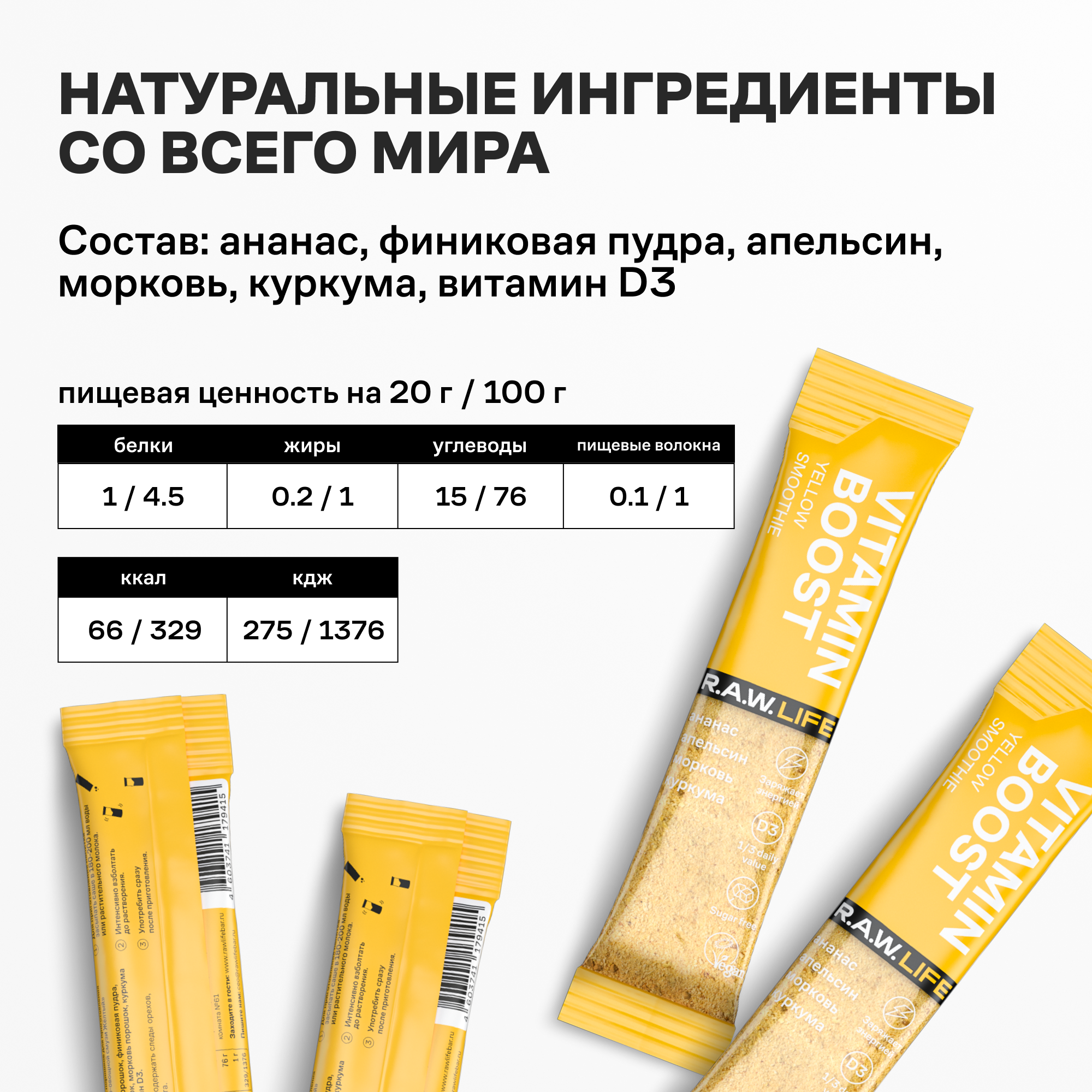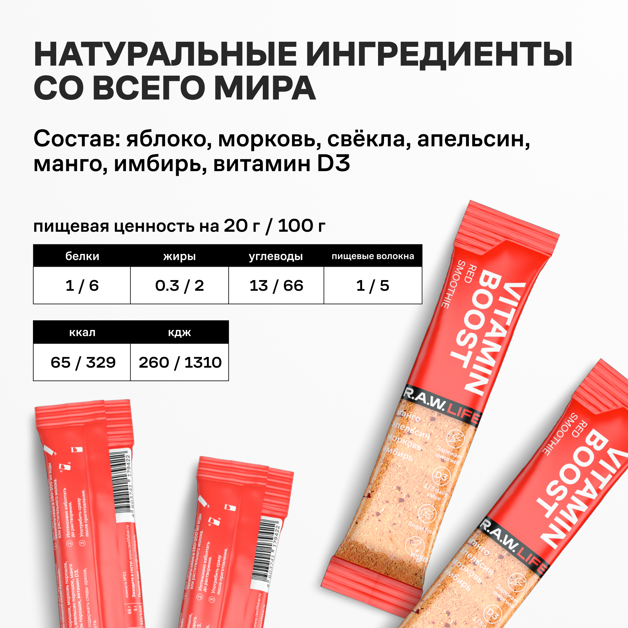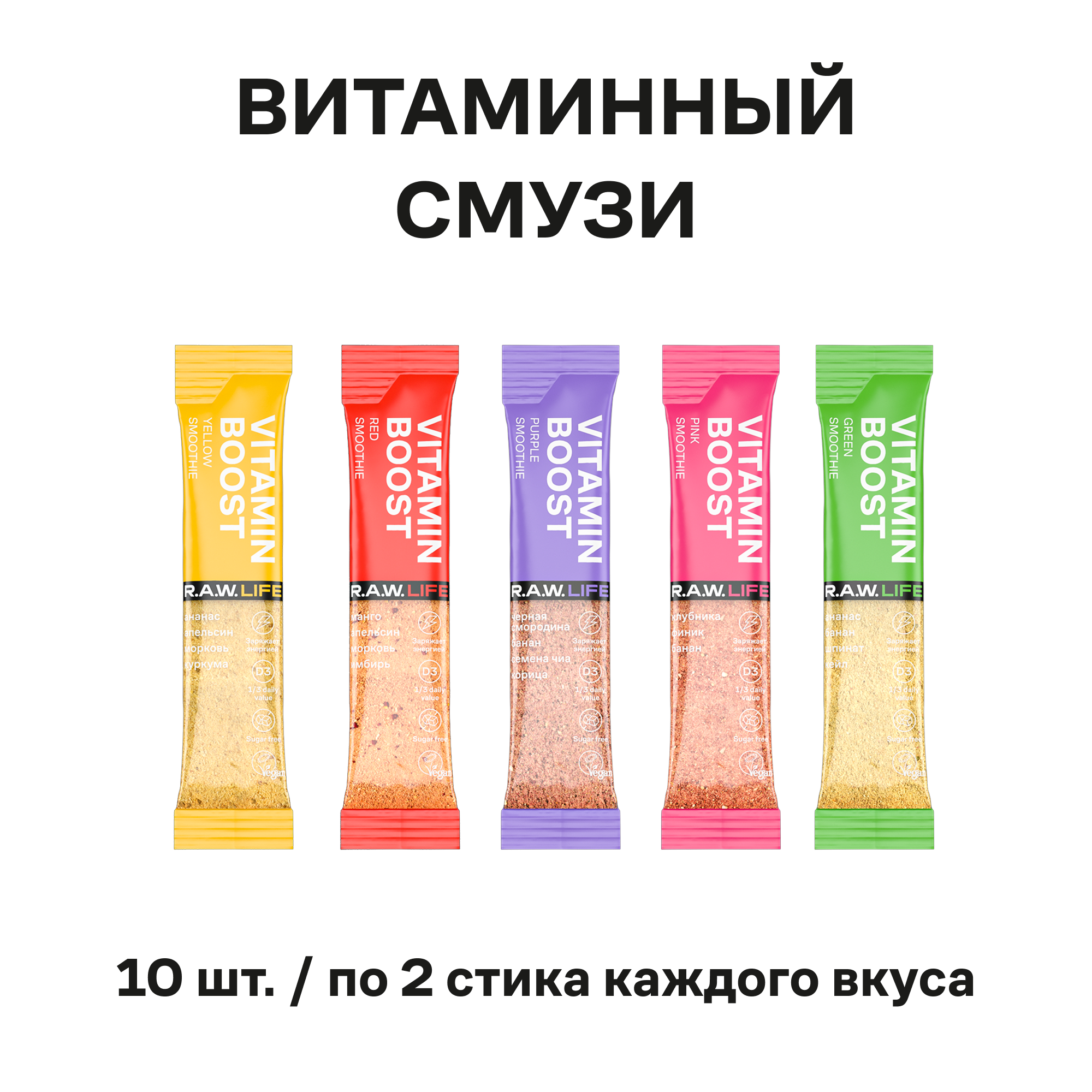 Купить Смузи Vitamin Boost D3 \ R.A.W.LIFE Порошок в стиках для приготовления витаминного коктейля \ Ассорти 10 шт х 20г (5 вкусов по 2 саше)