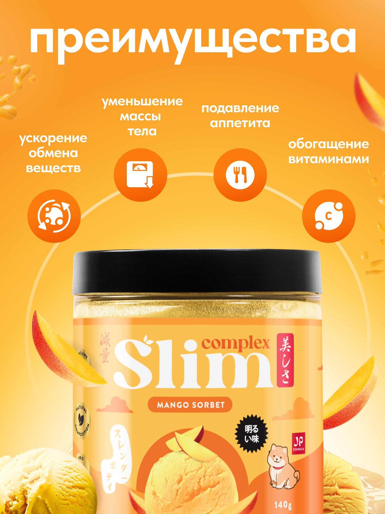 Купить Коктейль для похудения протеиновый без сахара Slim комплекс витаминов Japan Formula, вкус манговый сорбет