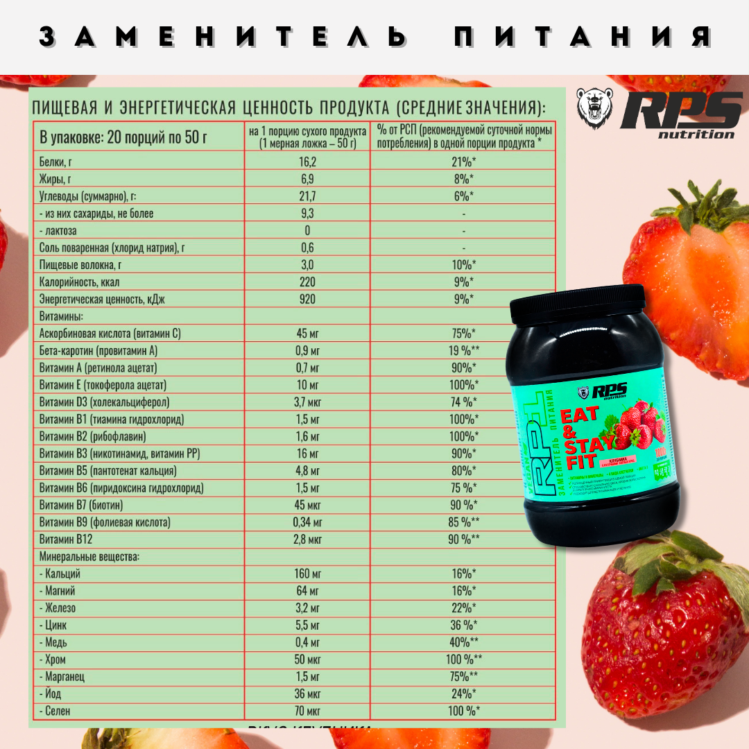 Купить Заменитель питания EAT AND STAY FIT VEGAN RPS NUTRITION Банка 1000г Вкус: Клубника (с кусочками клубники)