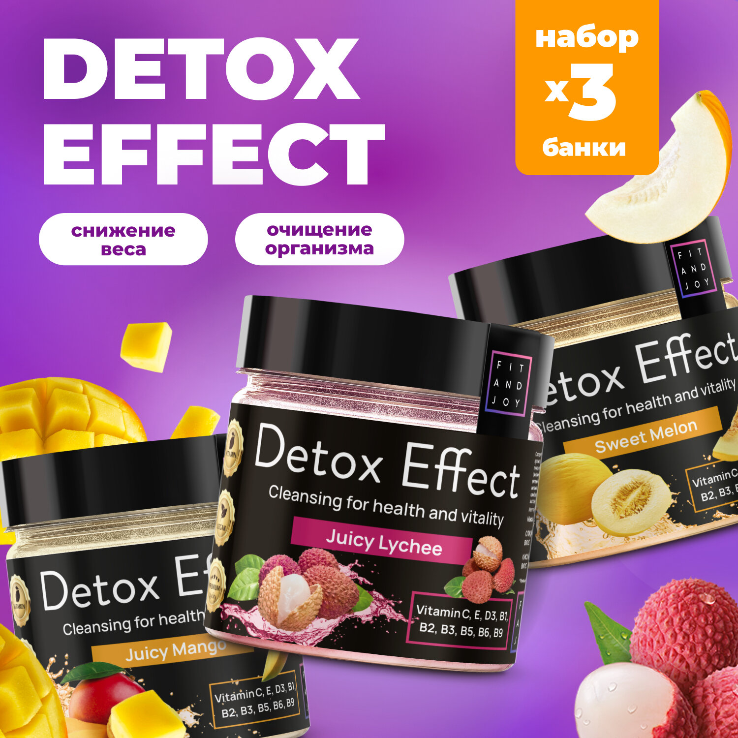 Дренажный напиток для похудения от отеков детокс коктейль Fit and Joy 3 шт, вкус манго личи ананас