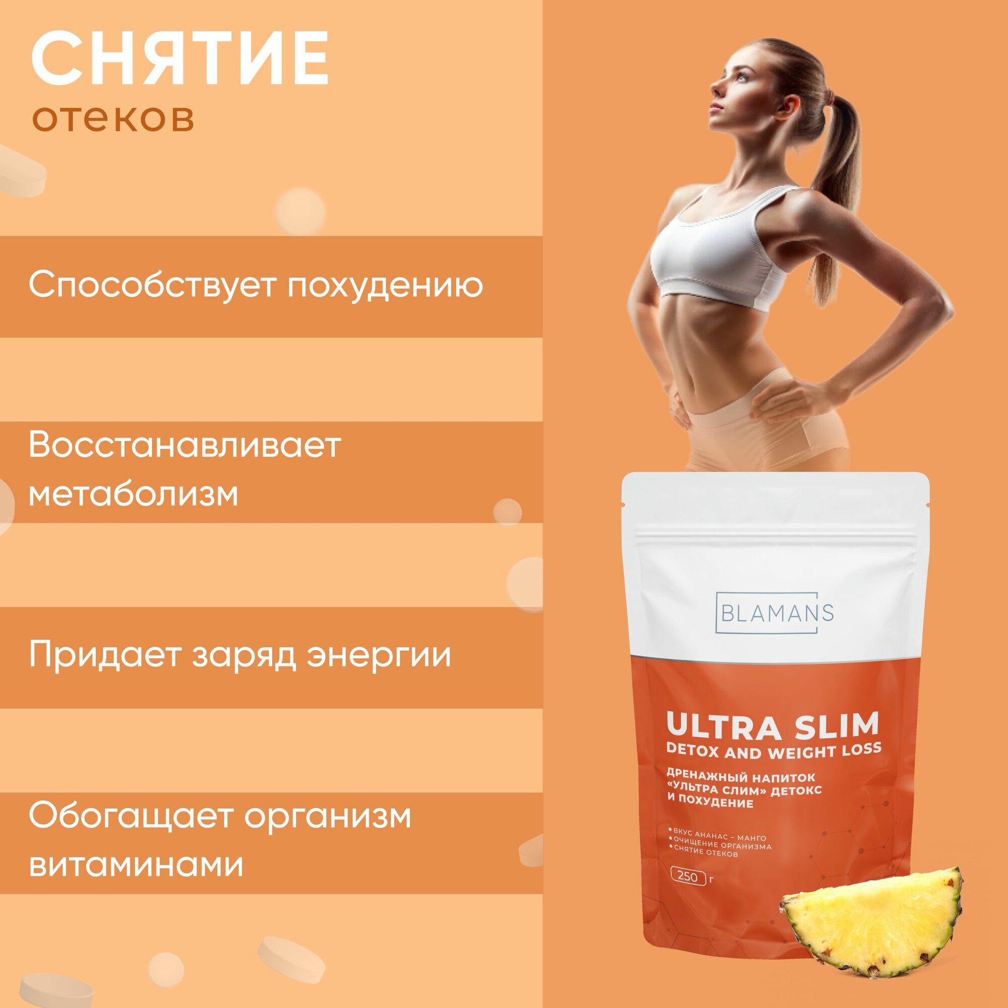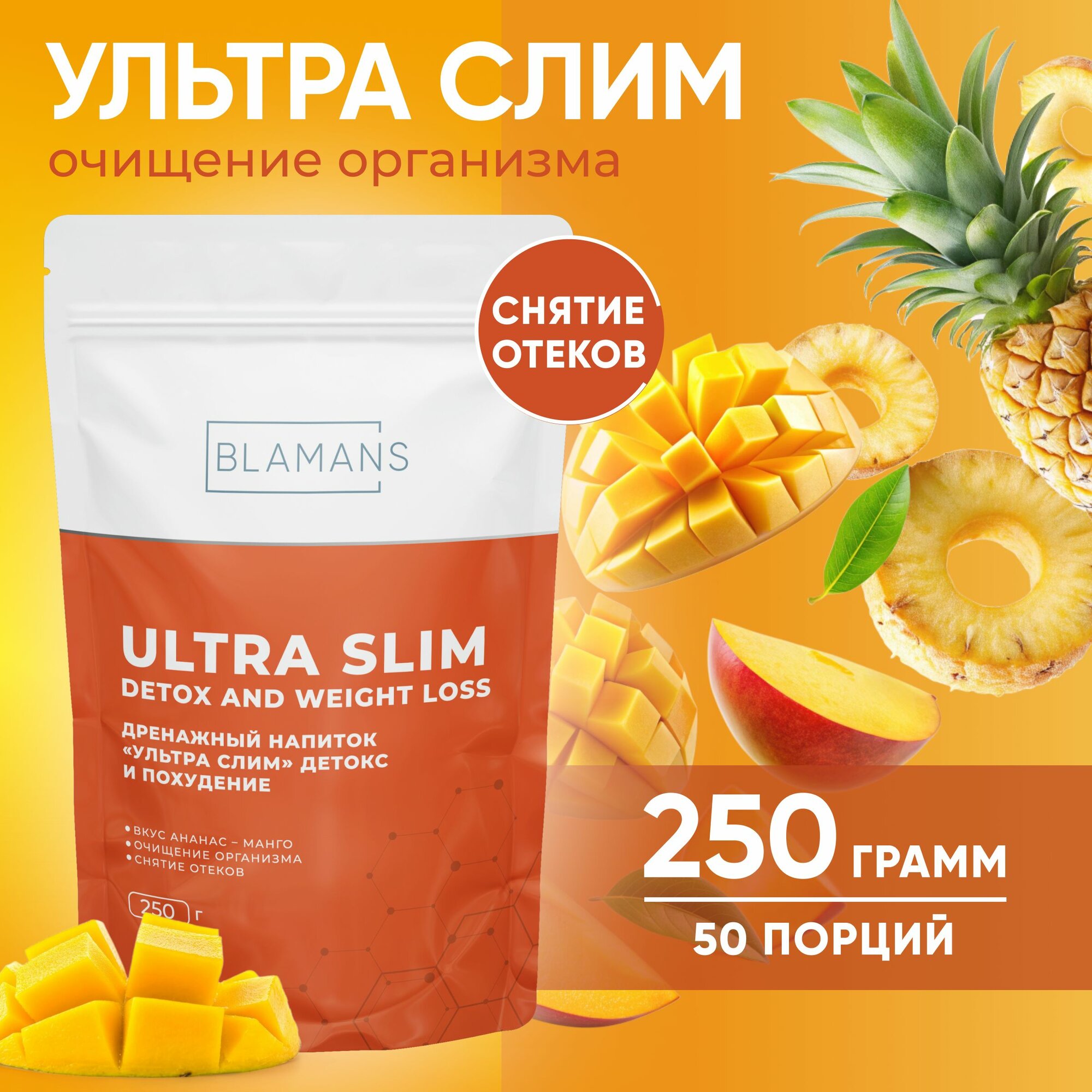 Дренажный напиток для похудения со вкусом Манго - ананас, детокс, против отёков, очищающий 250 грамм интересное: