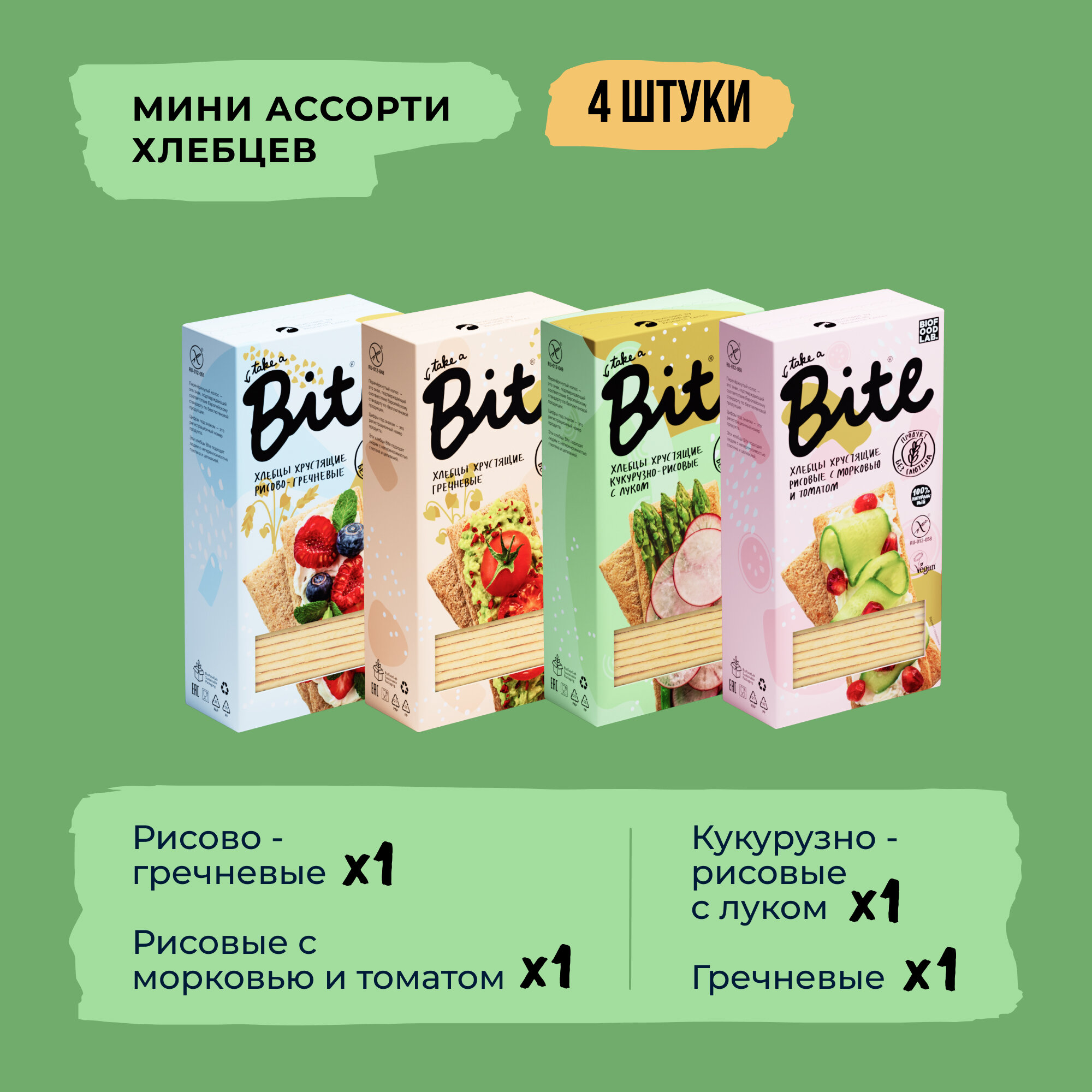 Хлебцы без глютена Take a Bite, ассорти 4 вкусов, 4 шт по 150 гр интересное:
