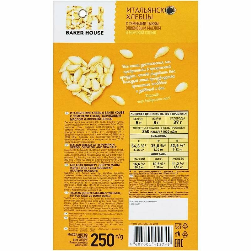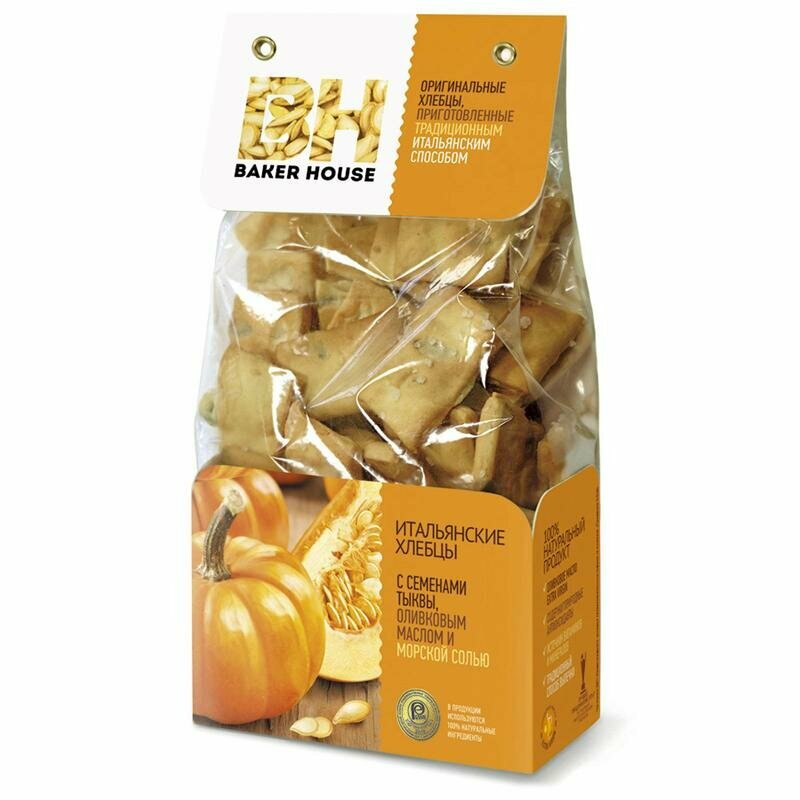Купить Хлебцы Baker House Итальянские с семенами тыквы, оливковым маслом, морской солью 250гр (7шт)