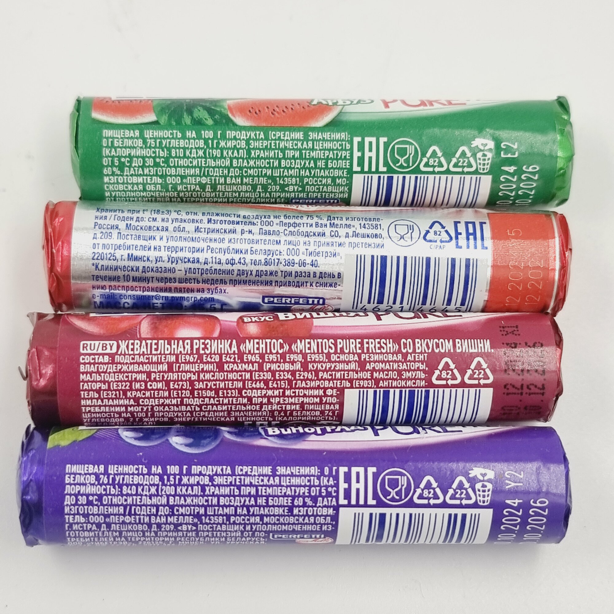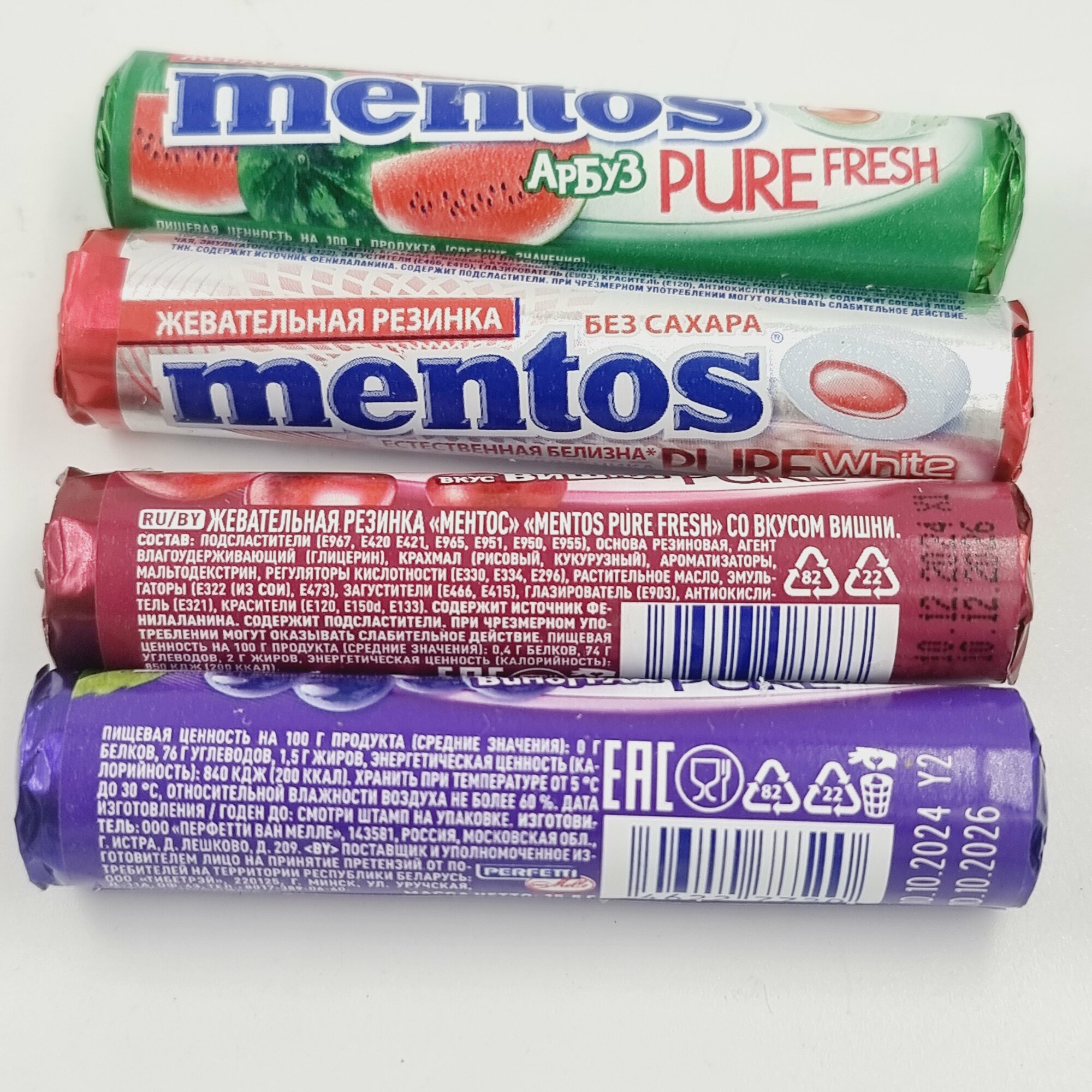 Ниже Вы можете прочитать отзывы на Mentos жевательная резинка Pure White вкус Клубника, Виноград, Вишня, Арбуз (15,5х4) 62 г, ознакомится с подробными характеристиками, посмотреть интересные обзоры и фотографии на Mentos жевательная резинка Pure White вкус Клубника, Виноград, Вишня, Арбуз (15,5х4) 62 г.