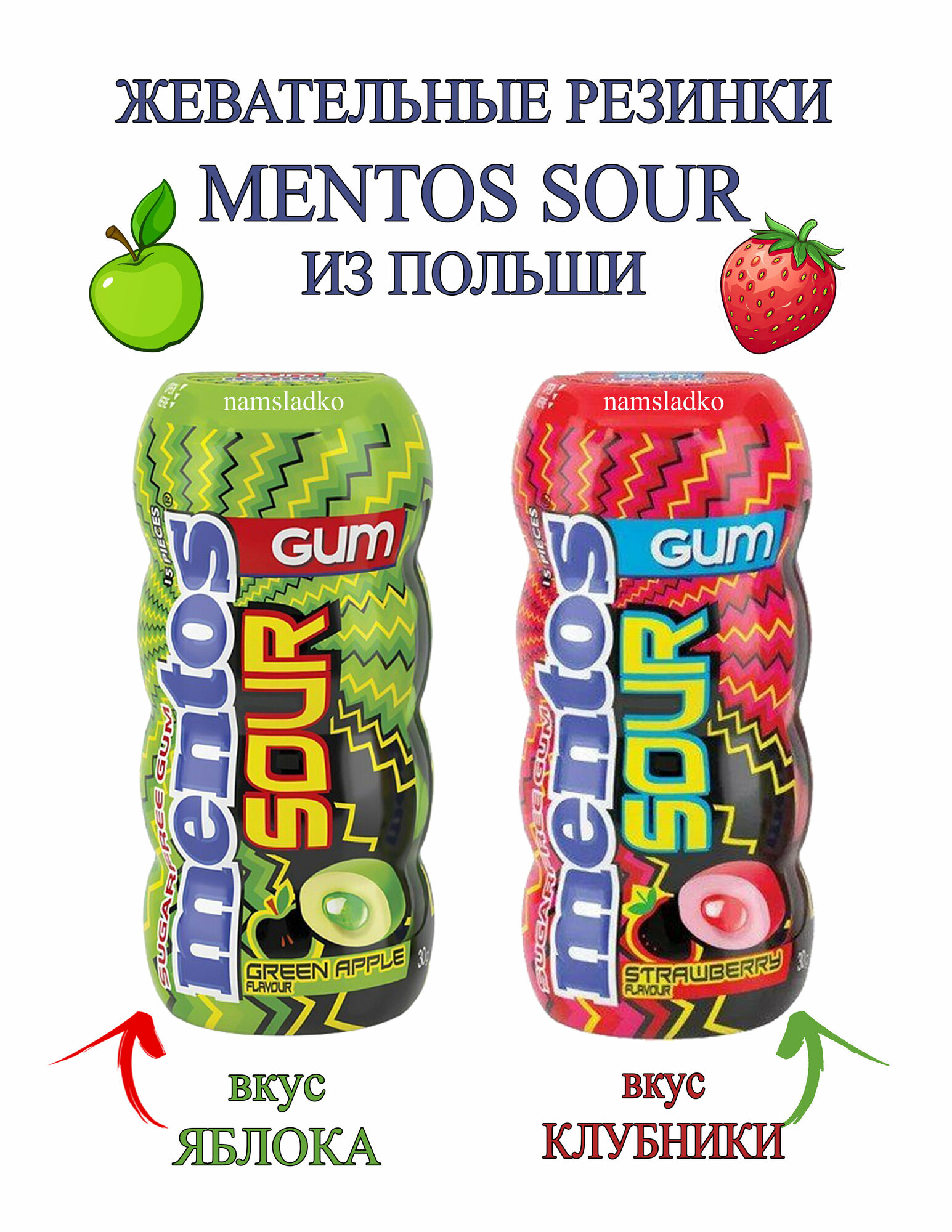 Жевательная резинка Mentos Sour Зеленое яблоко и Клубника, 2шт*30 гр, Польша. интересное: