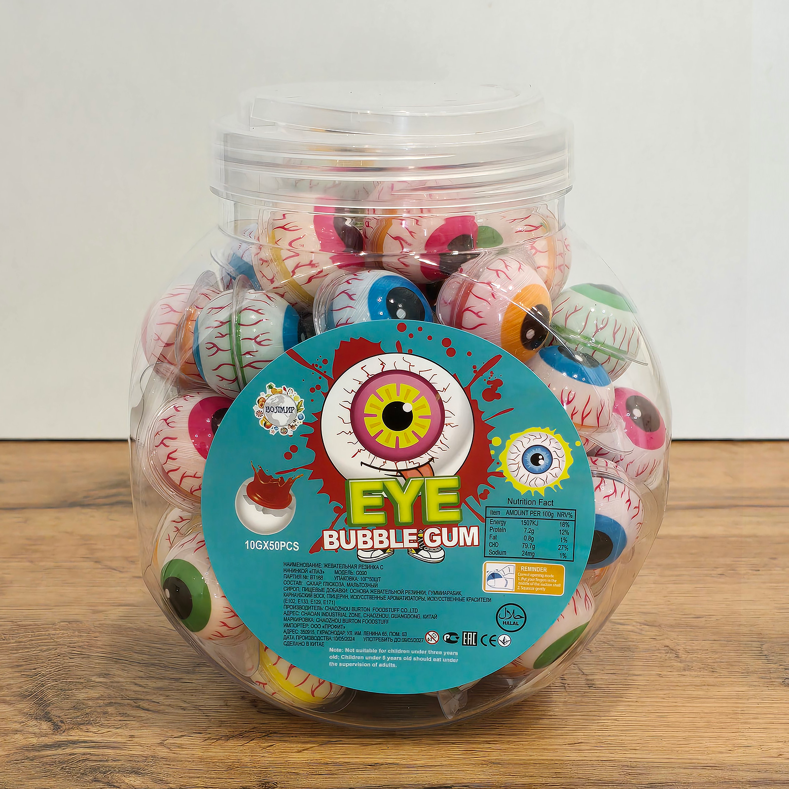 Купить Твердая жевательная резинка с начинкой Глаз (50 шт. по 10 г). Фруктовая жвачка в блистерах и банке для детей