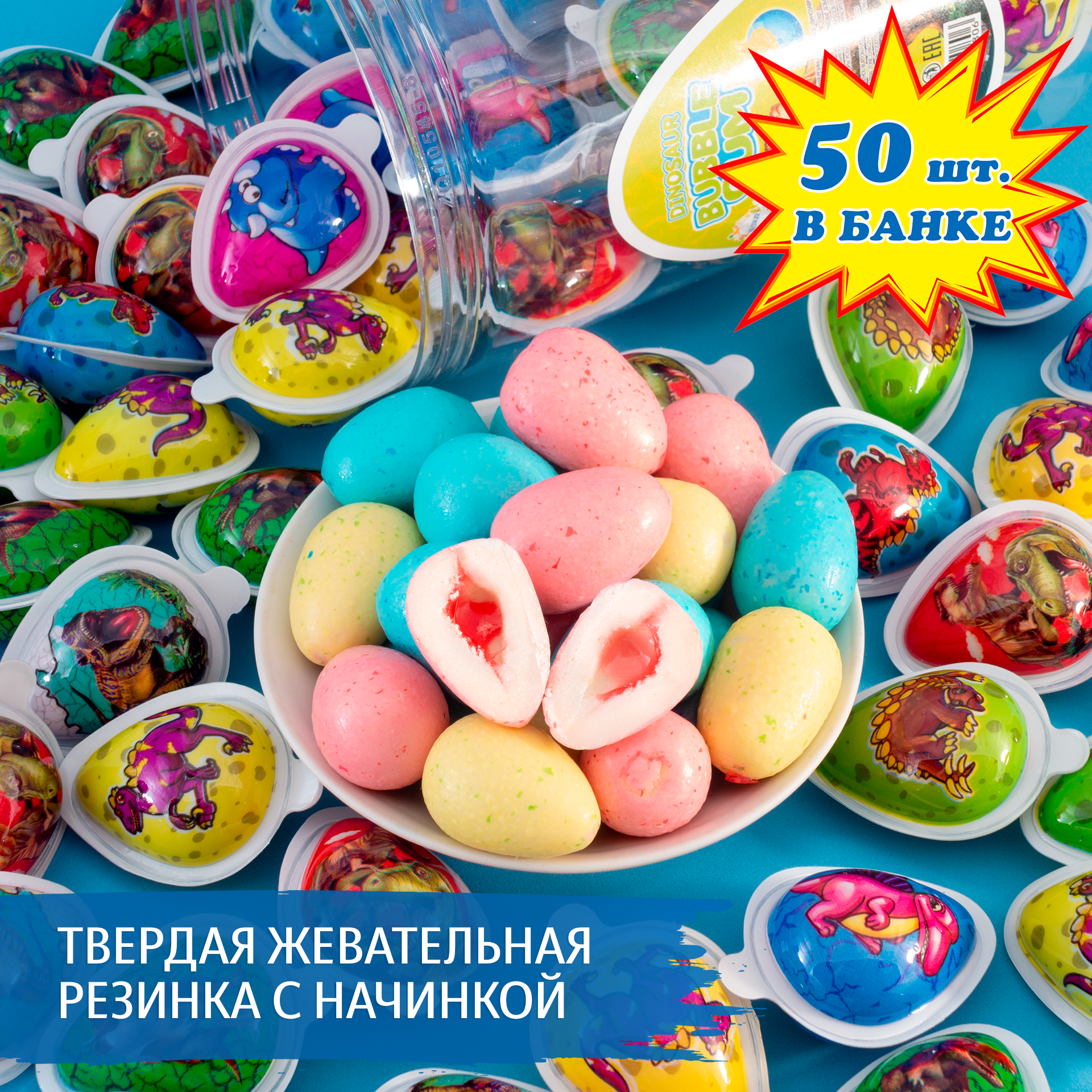 Купить Твердая жевательная резинка с начинкой Динозавр (50 шт. по 10 г). Фруктовая жвачка для детей в форме яиц динозавра в блистерах и банке