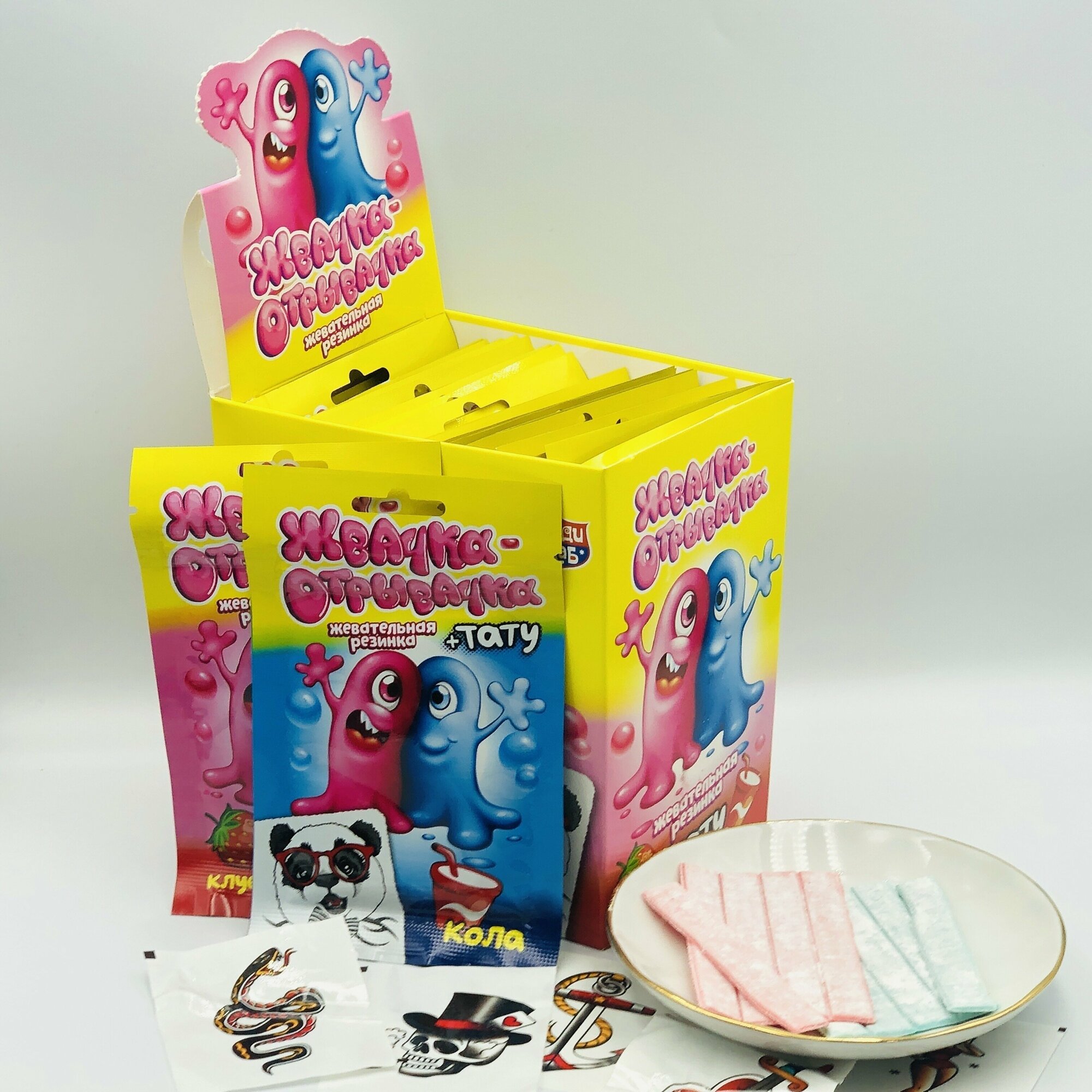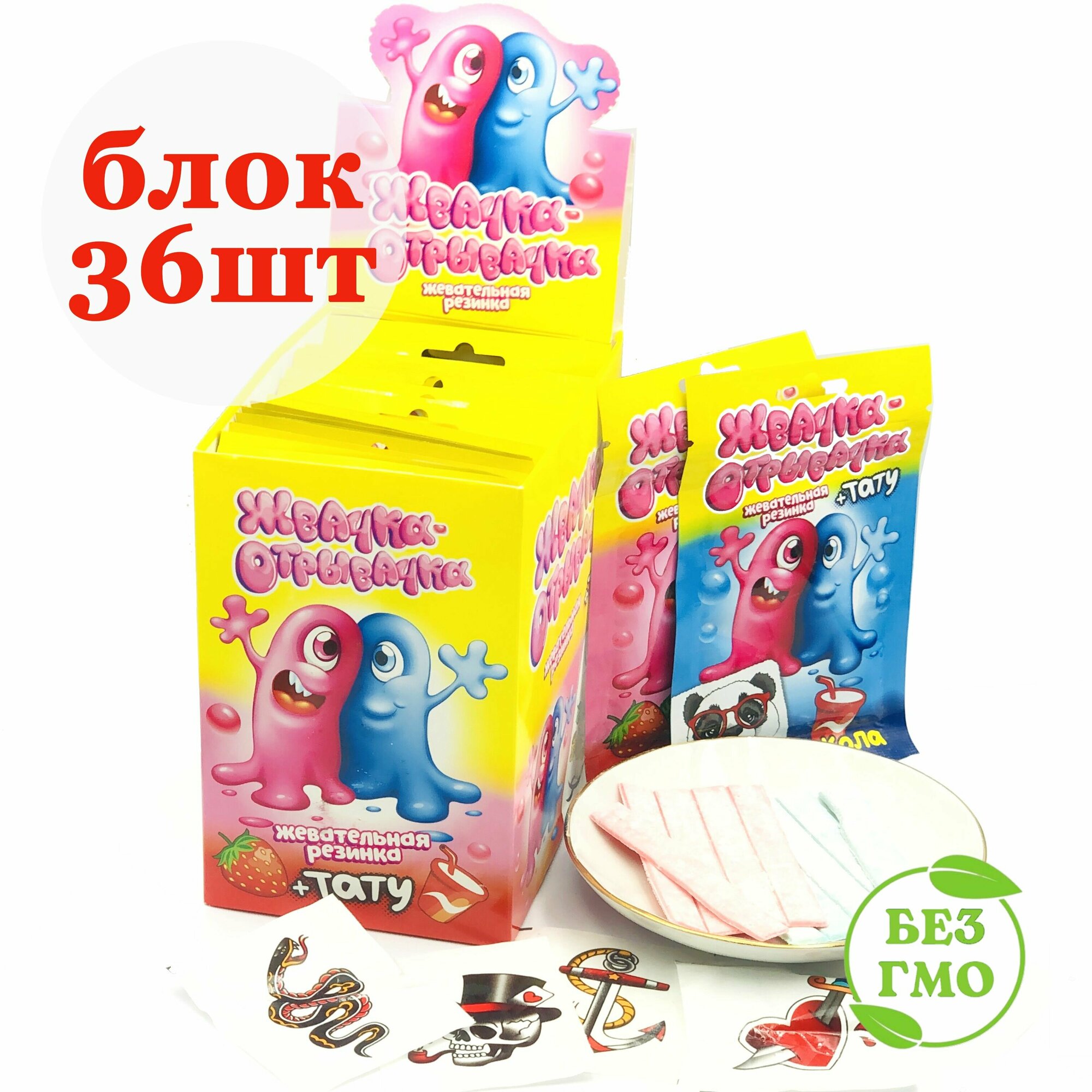 Купить Жевательная резинка с татуировкой жвачка-отрывачка (блок 36 упаковок по 10гр - 180 пластинок) Канди Клаб ассорти вкус клубника и кола + вкладыши наклейки переводилки тату. Сладости подарок на праздник
