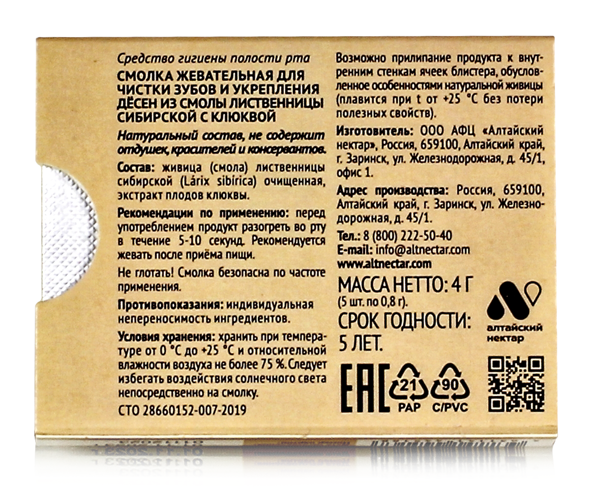 Смолка жевательная "Живица", с клюквой 5шт по 0.8гр интересное: