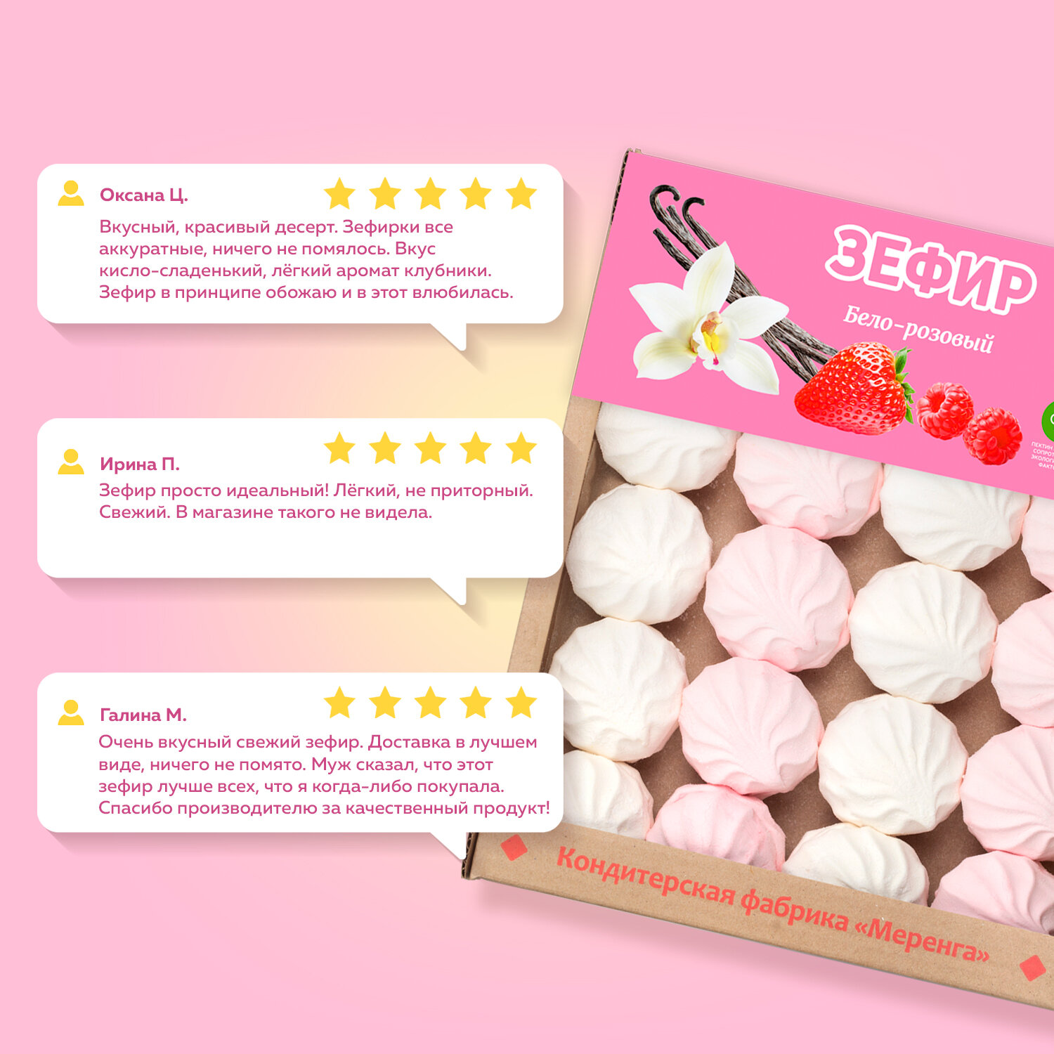 Ниже Вы можете прочитать отзывы на Зефир бело-розовый 900 грамм Меренга, ознакомится с подробными характеристиками, посмотреть интересные обзоры и фотографии на Зефир бело-розовый 900 грамм Меренга.