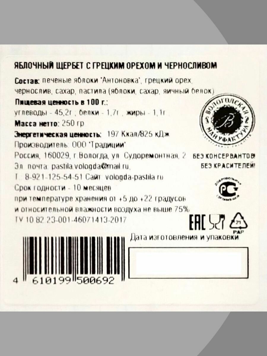 Яблочный щербет "Вологодская мануфактура" с грецким орехом и черносливом 250 гр. интересное: