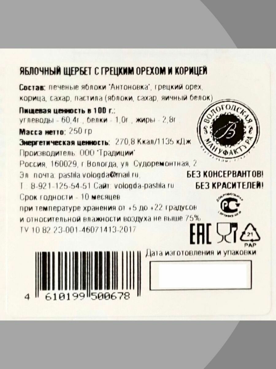 Ниже Вы можете прочитать отзывы на Яблочный щербет "Вологодская мануфактура" с грецким орехом и корицей 250 гр., ознакомится с подробными характеристиками, посмотреть интересные обзоры и фотографии на Яблочный щербет "Вологодская мануфактура" с грецким орехом и корицей 250 гр..