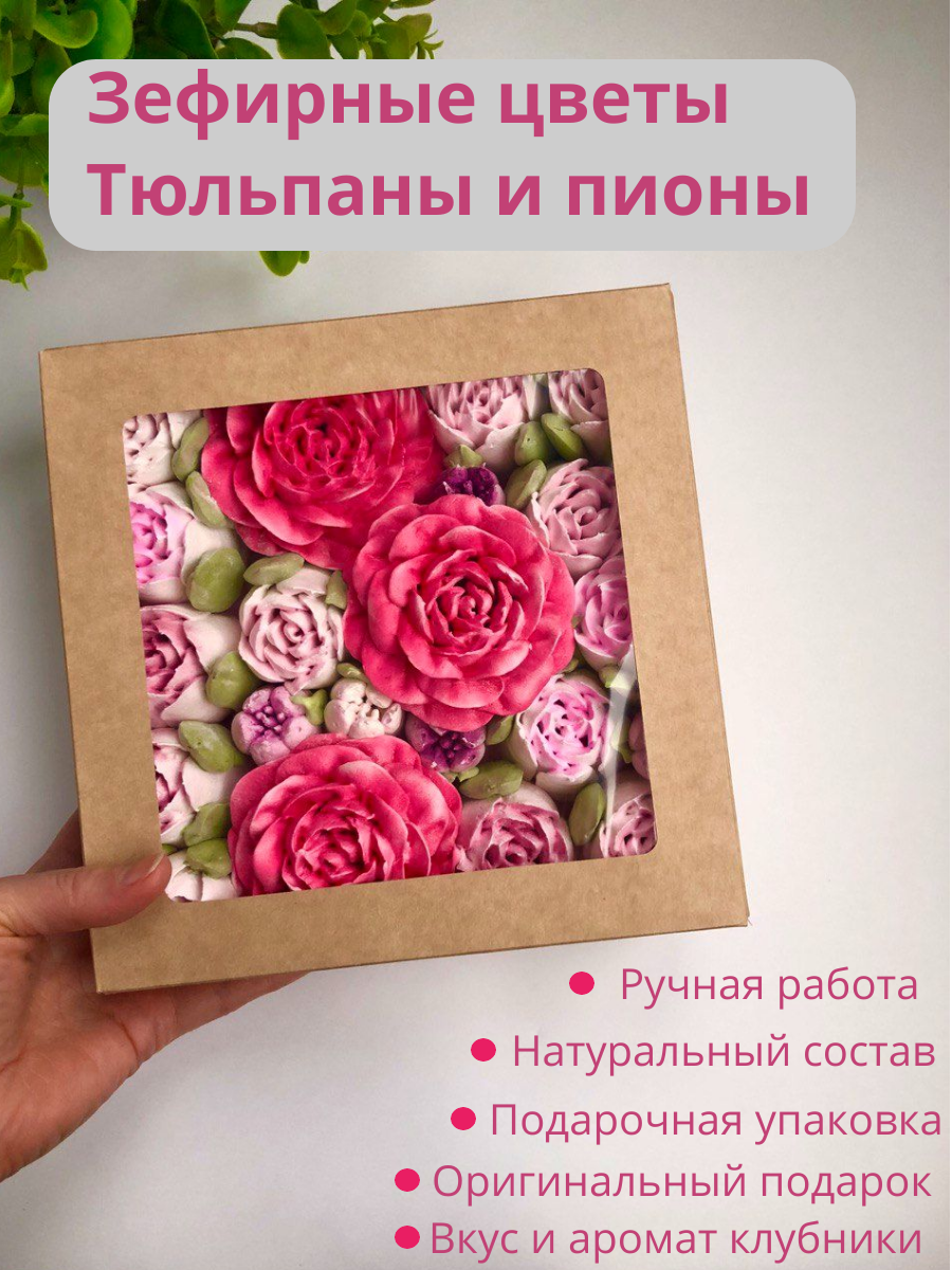 СохранитьЗефирные цветы ручной работы в подарочной коробке 20*20 см Тюльпаны и Пионы интересное: