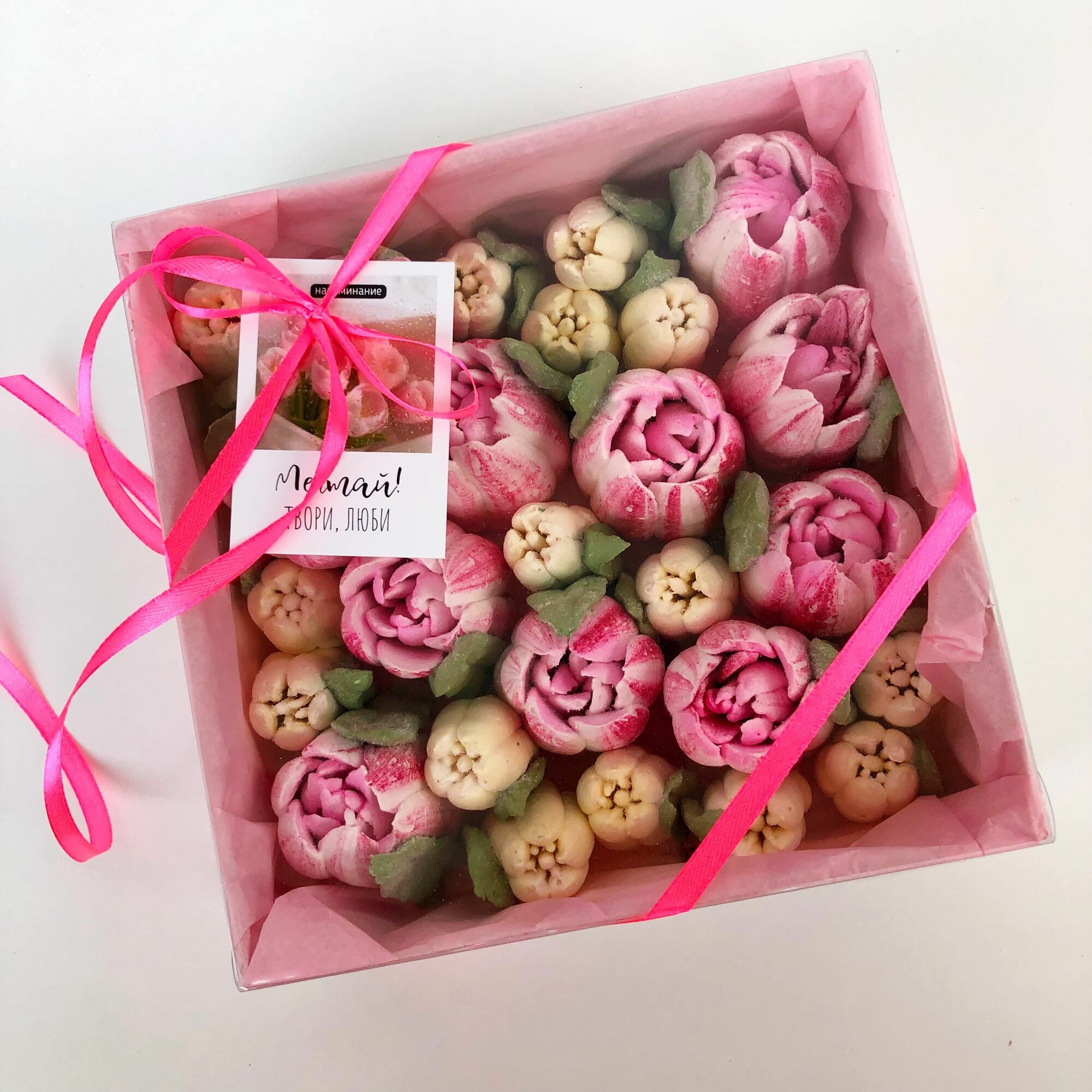 Зефирные цветы ручной работы Тюльпаны в подарочной коробке 20*20 см