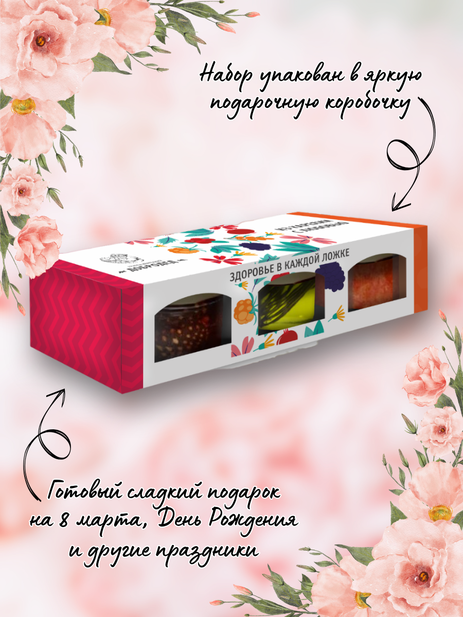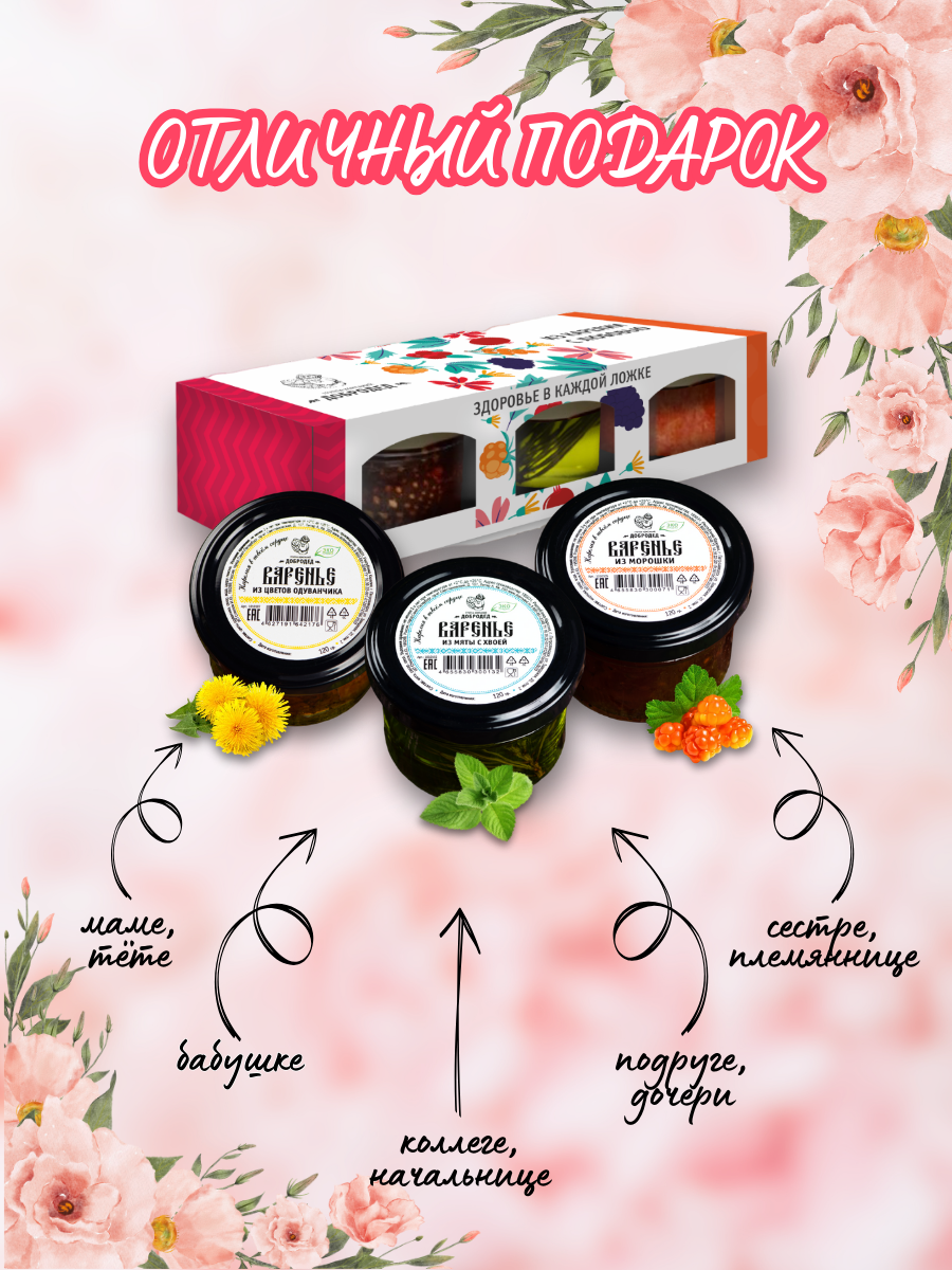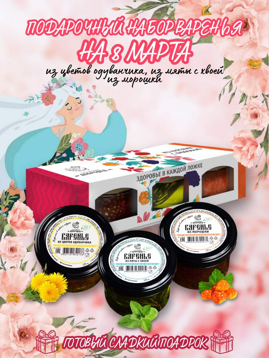 Купить Подарочный набор варенья из морошки, мяты с хвоей, цветов одуванчика, 3 банки, подарок на 8 марта