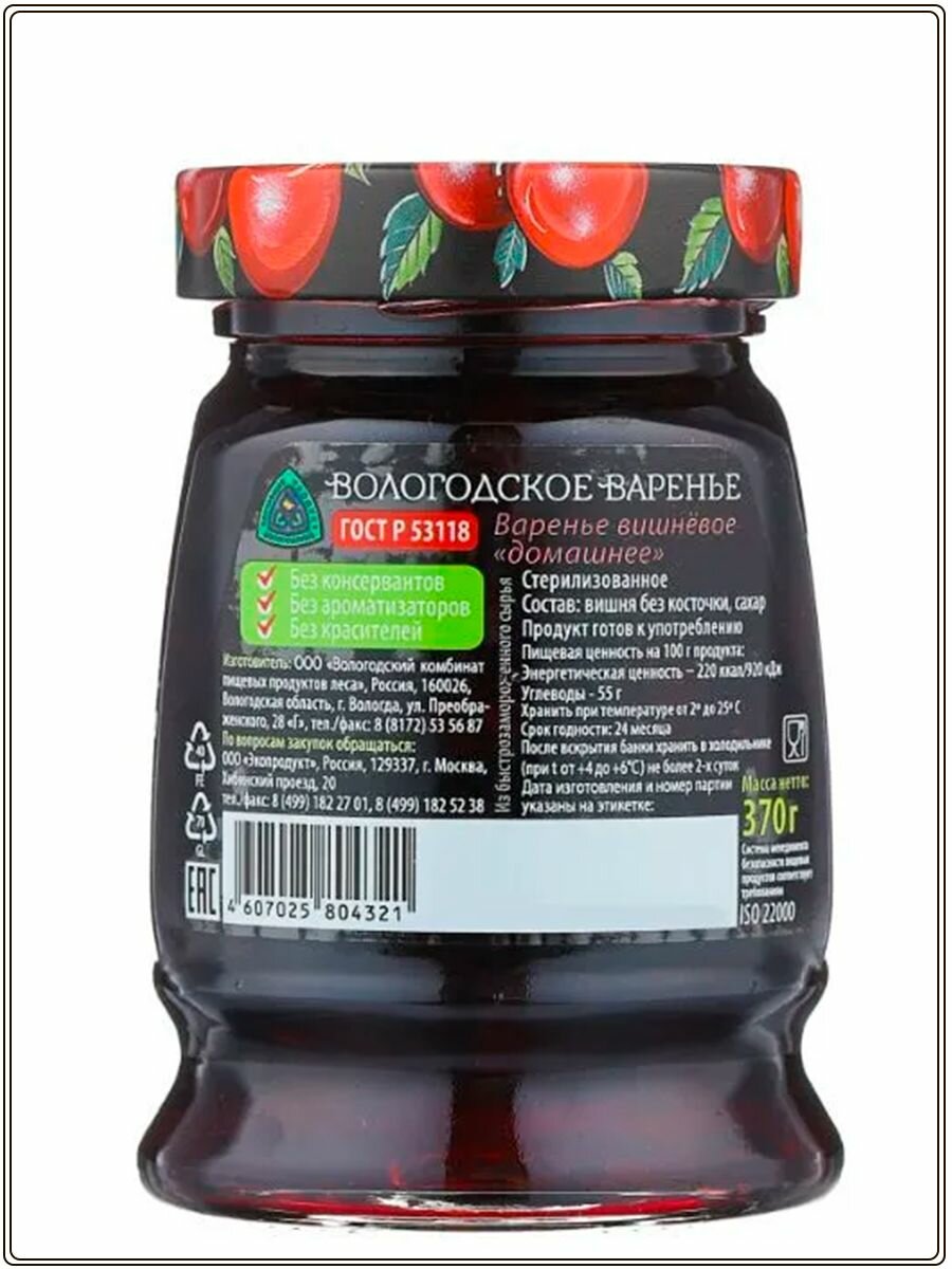 Экопродукт Варенье Вологодское Вишневое, 370 г, 3 шт