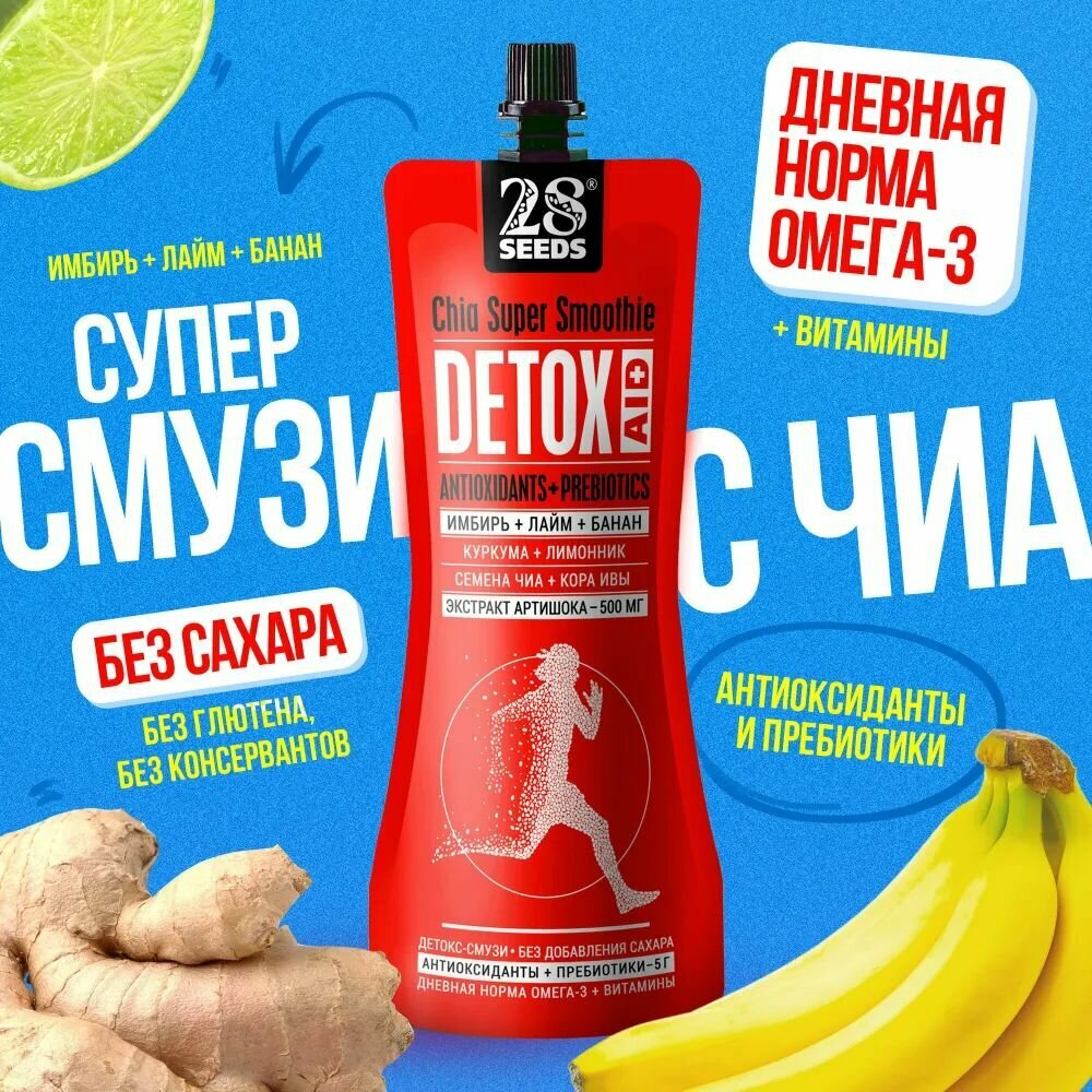 Супер-смузи 28SEEDS, смузи без сахара Чиа детокс Имбирь + Лайм + Банан, 10 шт