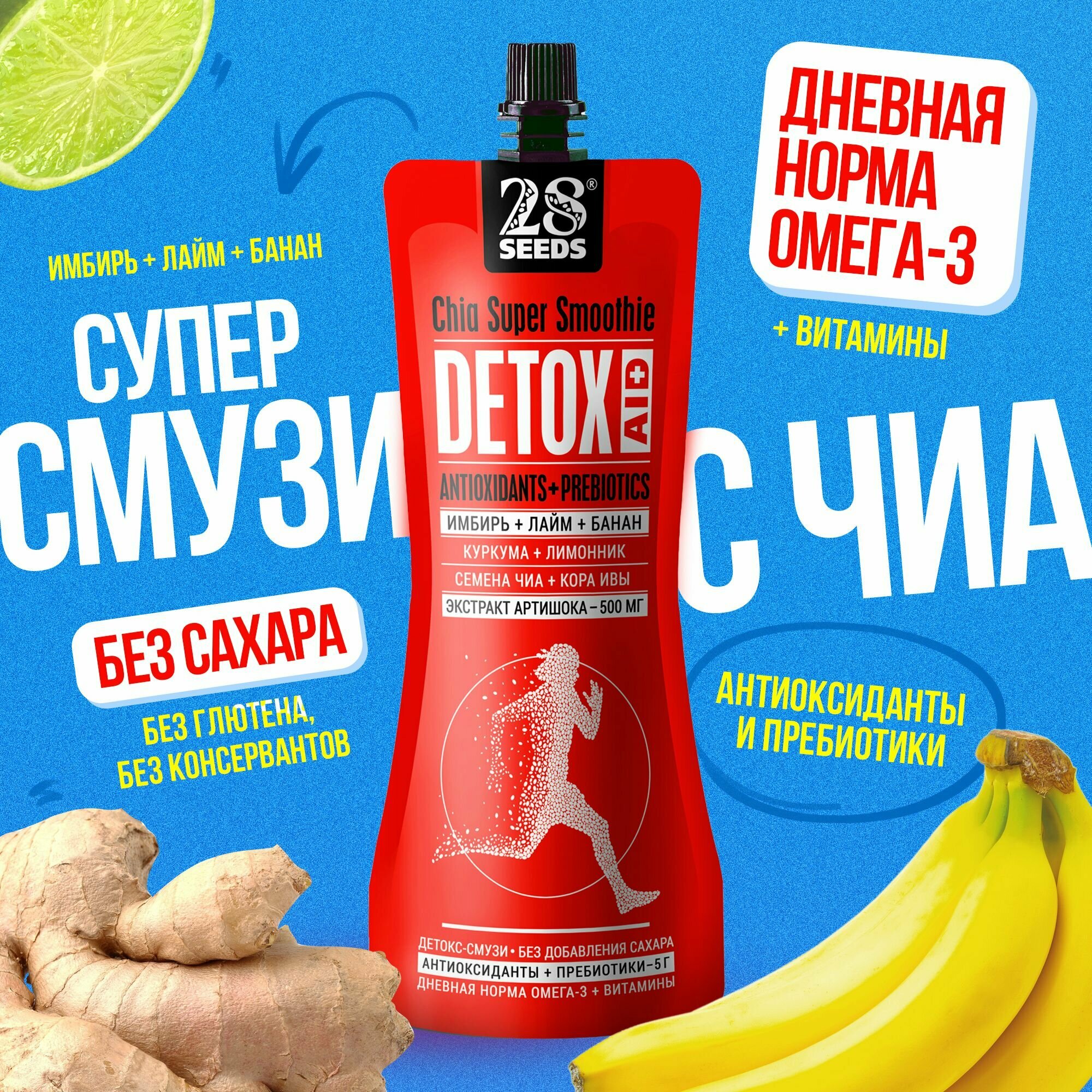 Супер-смузи 28SEEDS, смузи без сахара Чиа детокс Имбирь + Лайм + Банан, 10 шт интересное: