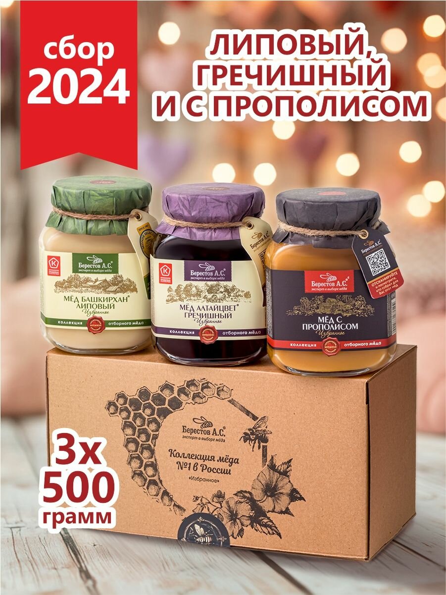 СохранитьНатуральный мед подарочный набор: Липовый, цветочный с прополисом, Гречишный. Берестов А. С, сбор 2024 года интересное: