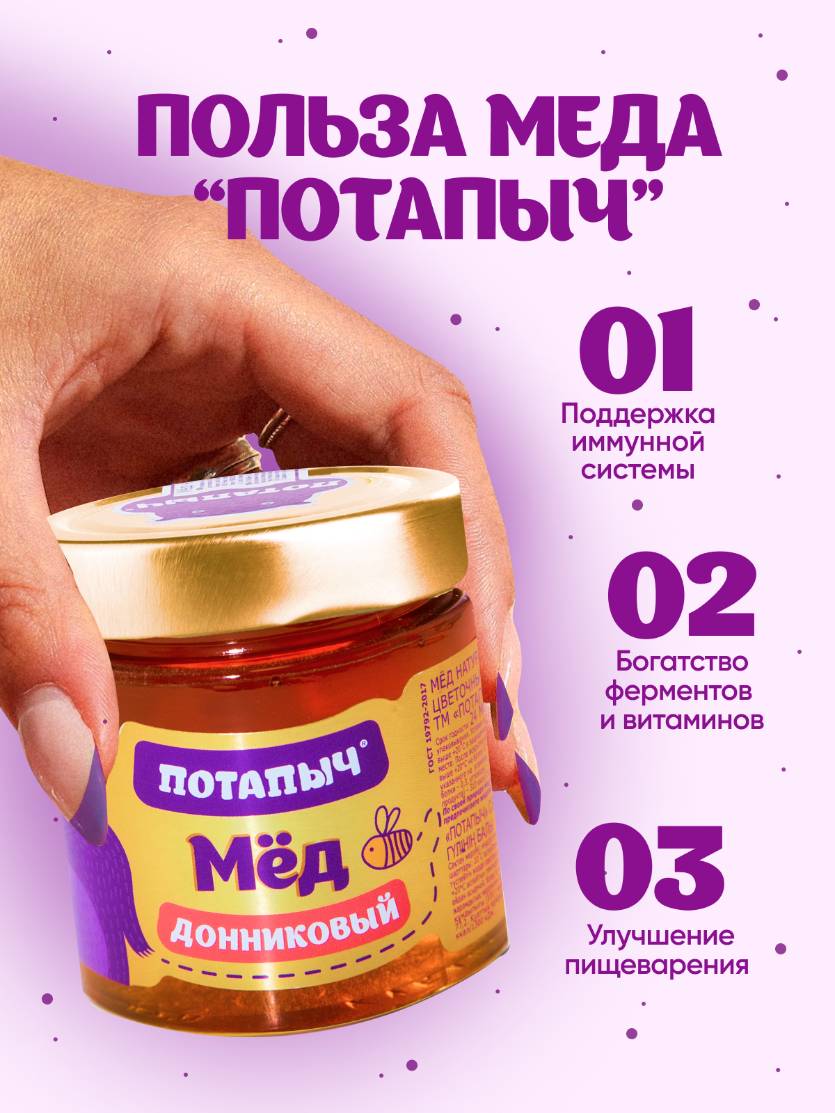 Мёд донниковый Потапыч натуральный без сахара и консервантов, ст/б 250г. интересное: