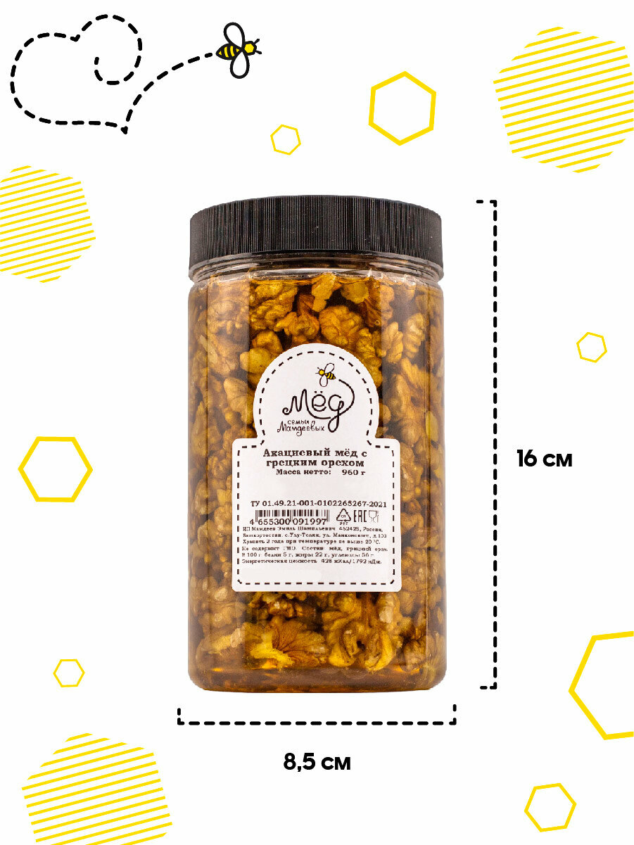 Акациевый мёд с грецким орехом, 960 г Мед с орехами, подарок без сахара интересное:
