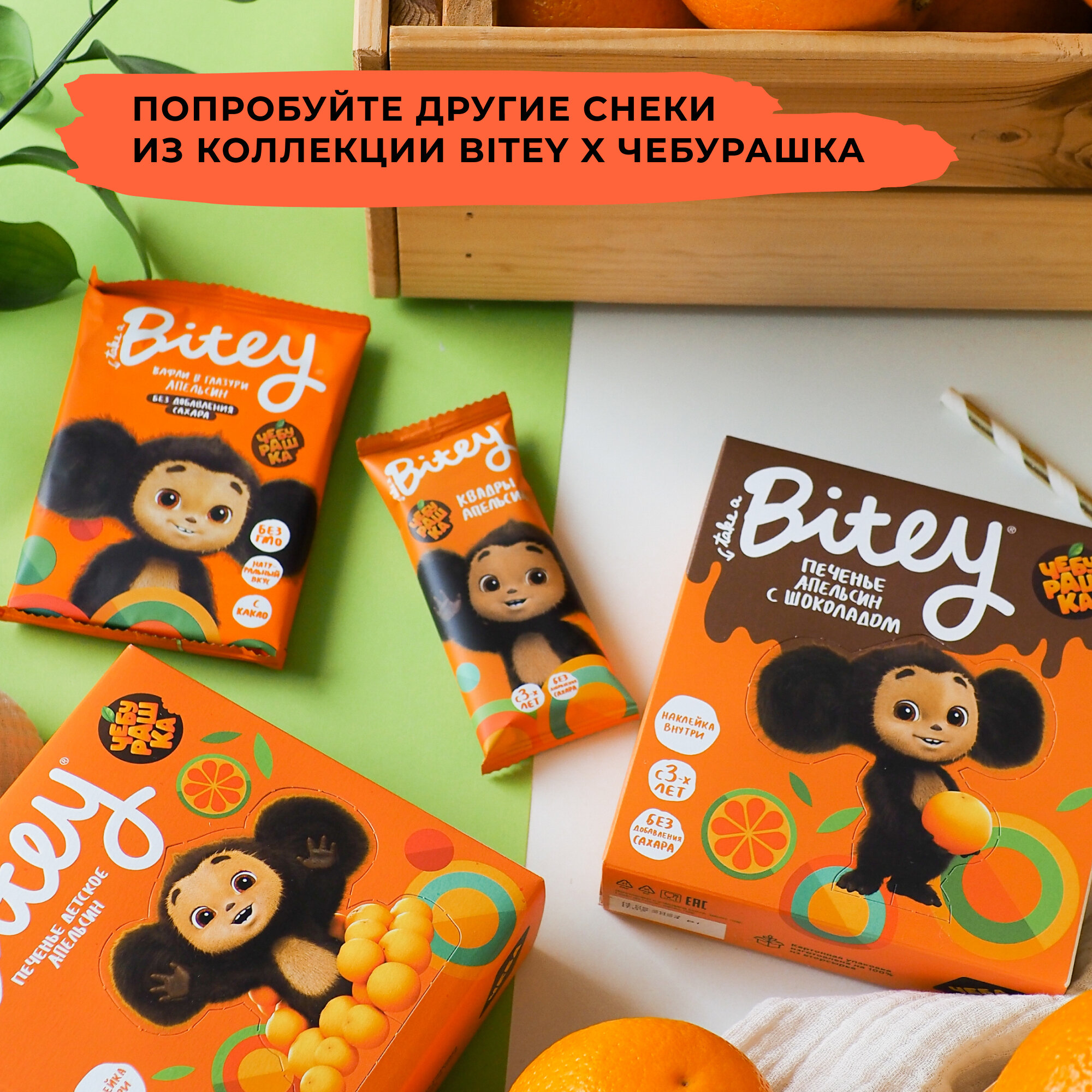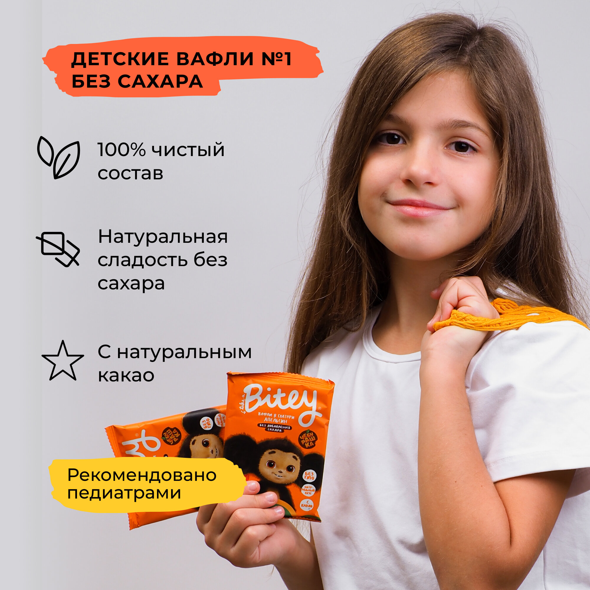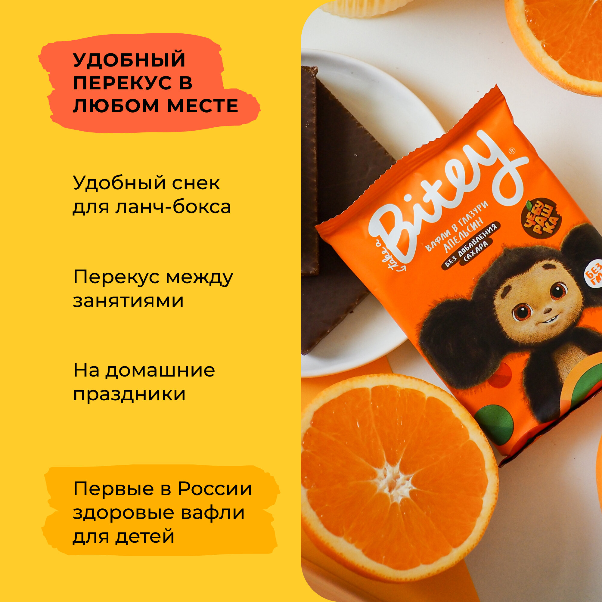 Вафли без сахара, Take a Bitey / Bite, Апельсин х Чебурашка, 10 шт по 35 гр интересное:
