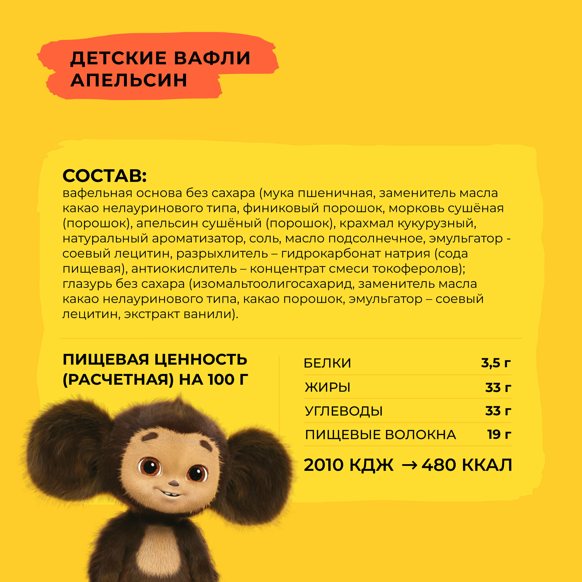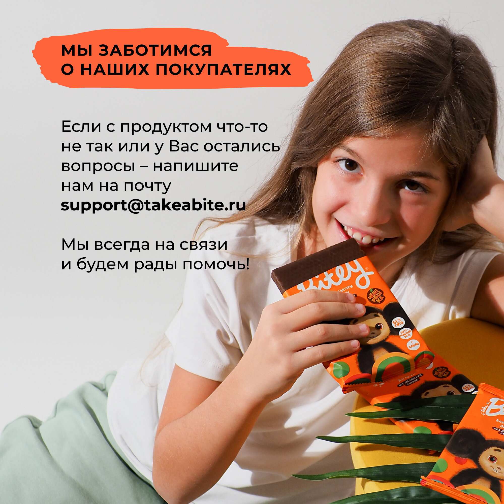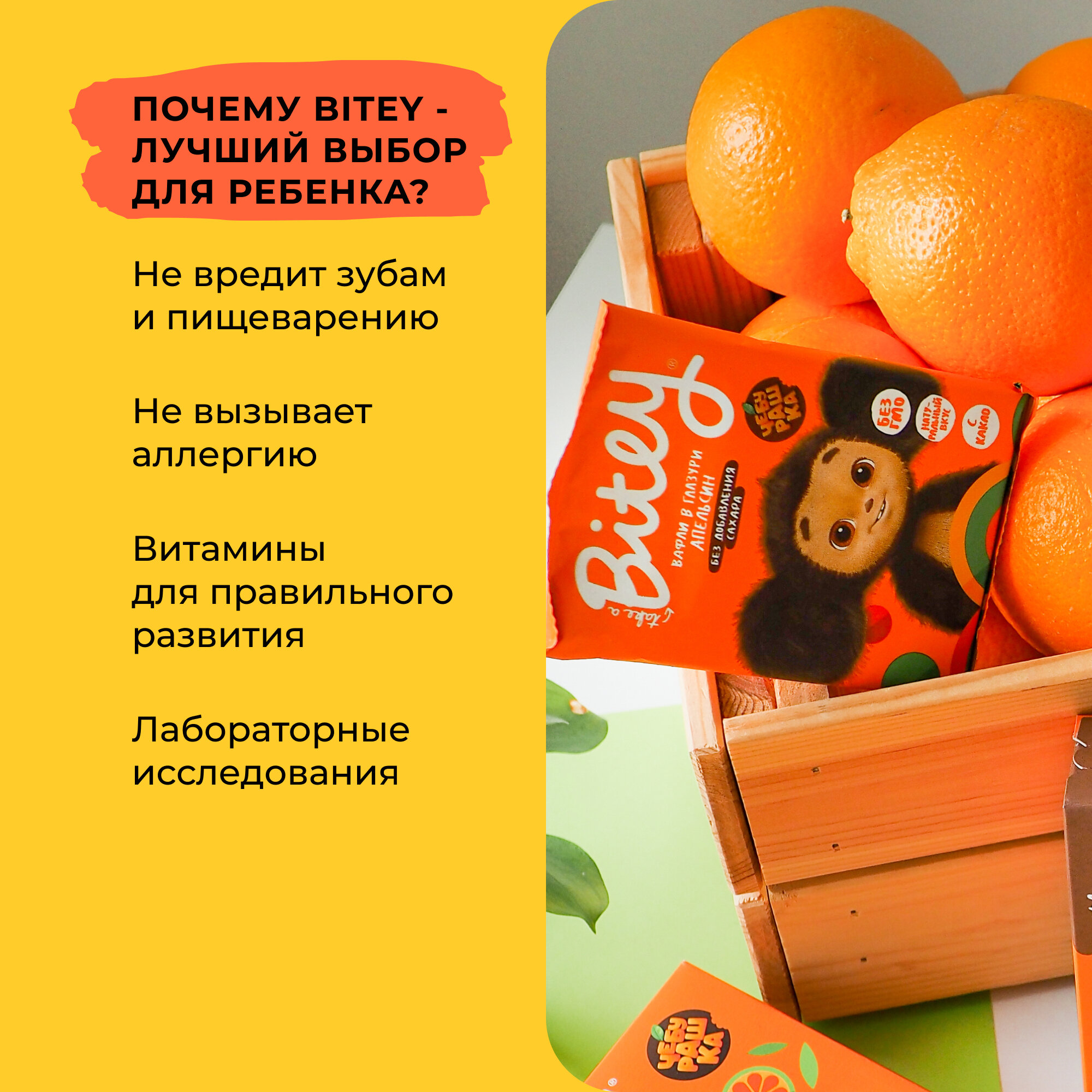 Вафли без сахара, Take a Bitey / Bite, Апельсин х Чебурашка, 10 шт по 35 гр интересное: