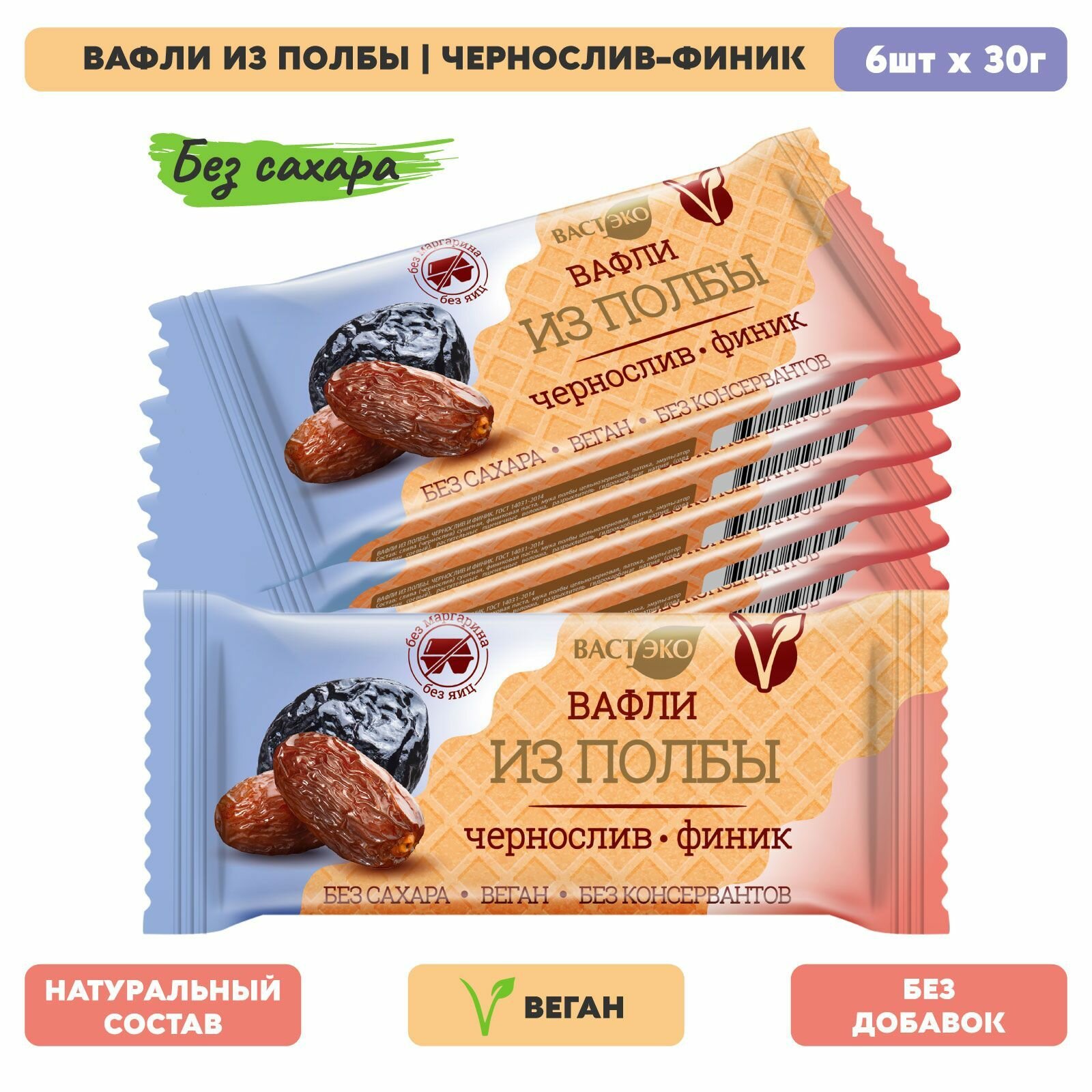 Вафли из полбы. Чернослив и финик. Без сахара, 6 шт. х 30 г, 180 г, Веган, здоровое питание интересное:
