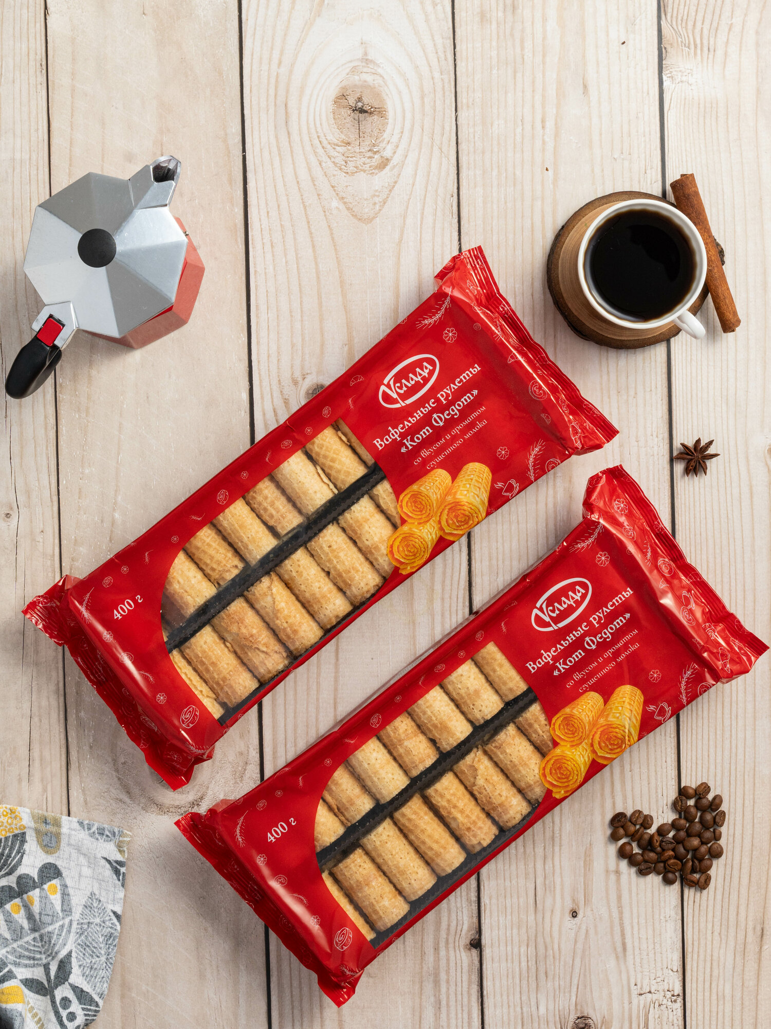 Вафельные рулетики Кот Федот со вкусом сгущенного молока, 2 шт по 400 гр Услада интересное: