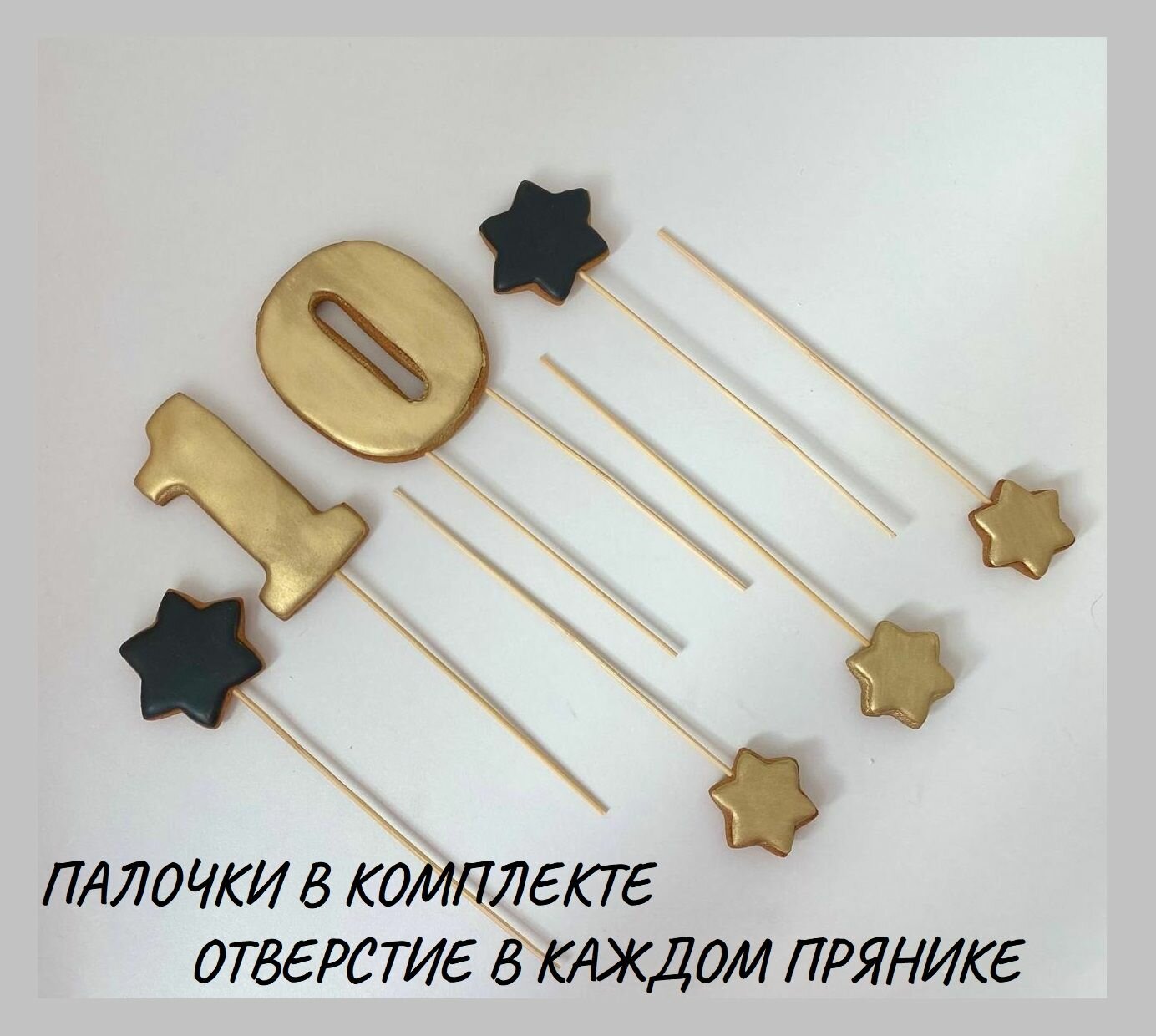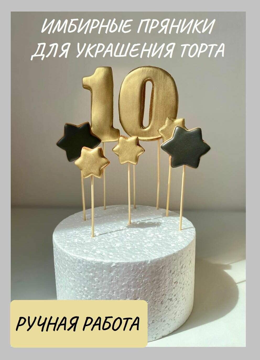 Купить Пряники имбирно-медовые для торта "10" золотые топпер на шпажках