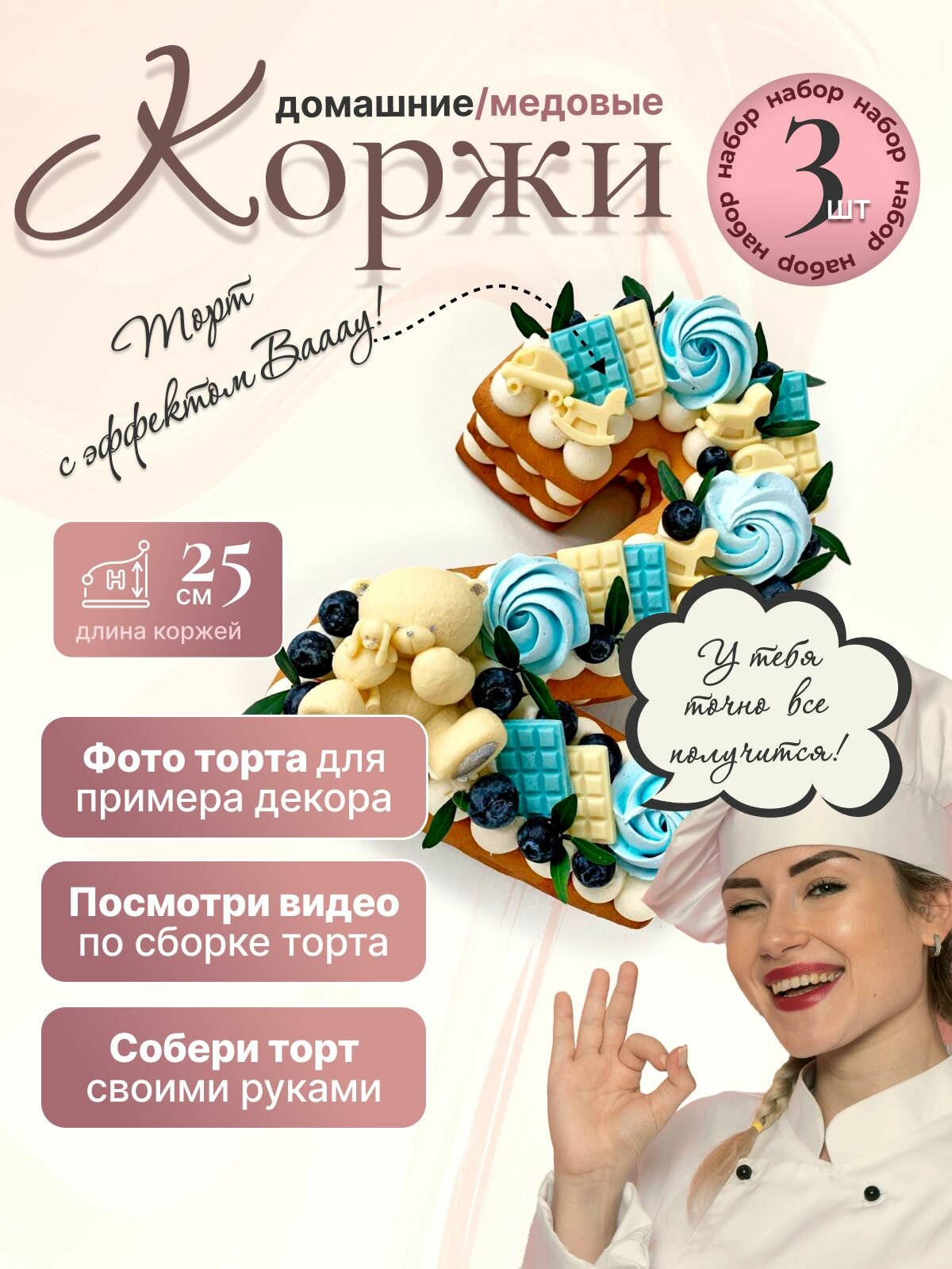 Медовый корж для торта "Цифра 3" красивый, открытый с эффектом ВАУ!