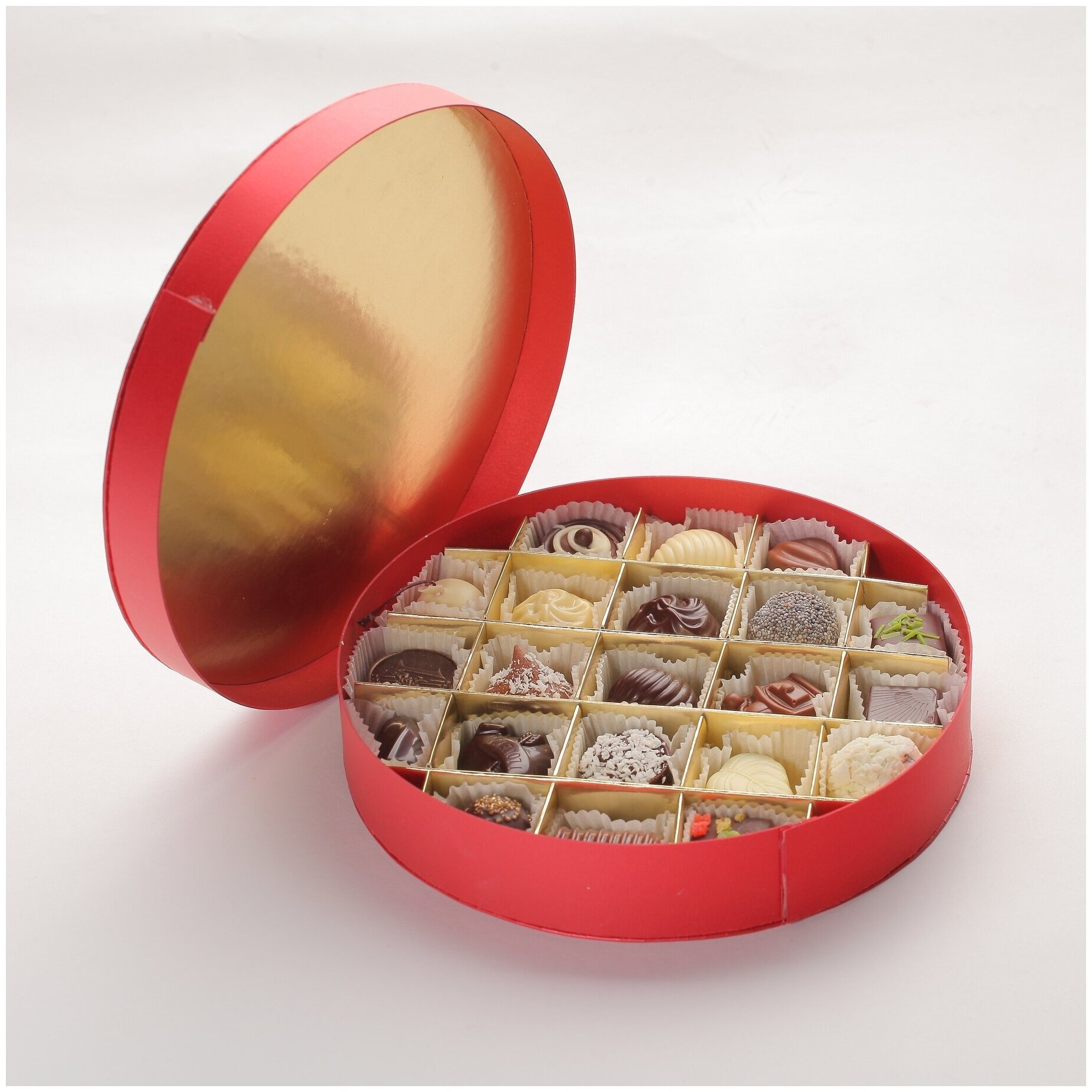 Коробка шоколадных конфет ручной работы Фраде - круглая большая (на 21 конфету) (золотые цветы) интересное: