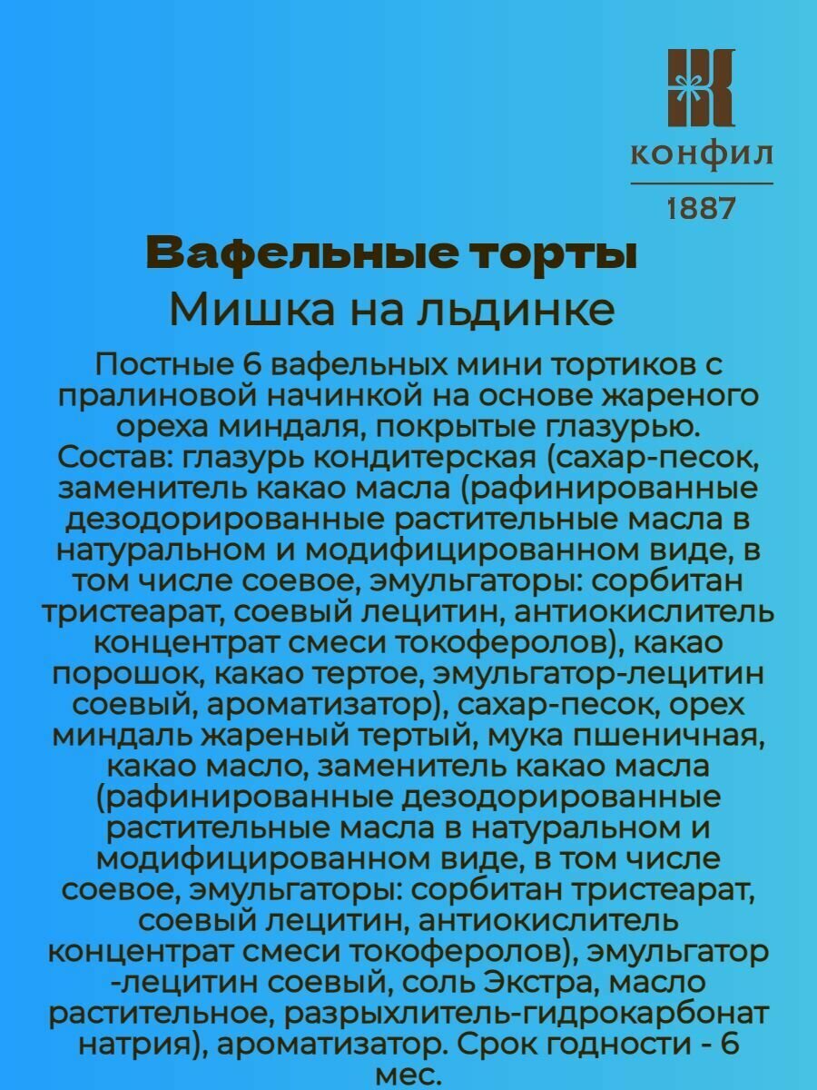 Ниже Вы можете прочитать отзывы на Вафельный торт Мишка на льдинке (200 грамм), ознакомится с подробными характеристиками, посмотреть интересные обзоры и фотографии на Вафельный торт Мишка на льдинке (200 грамм).