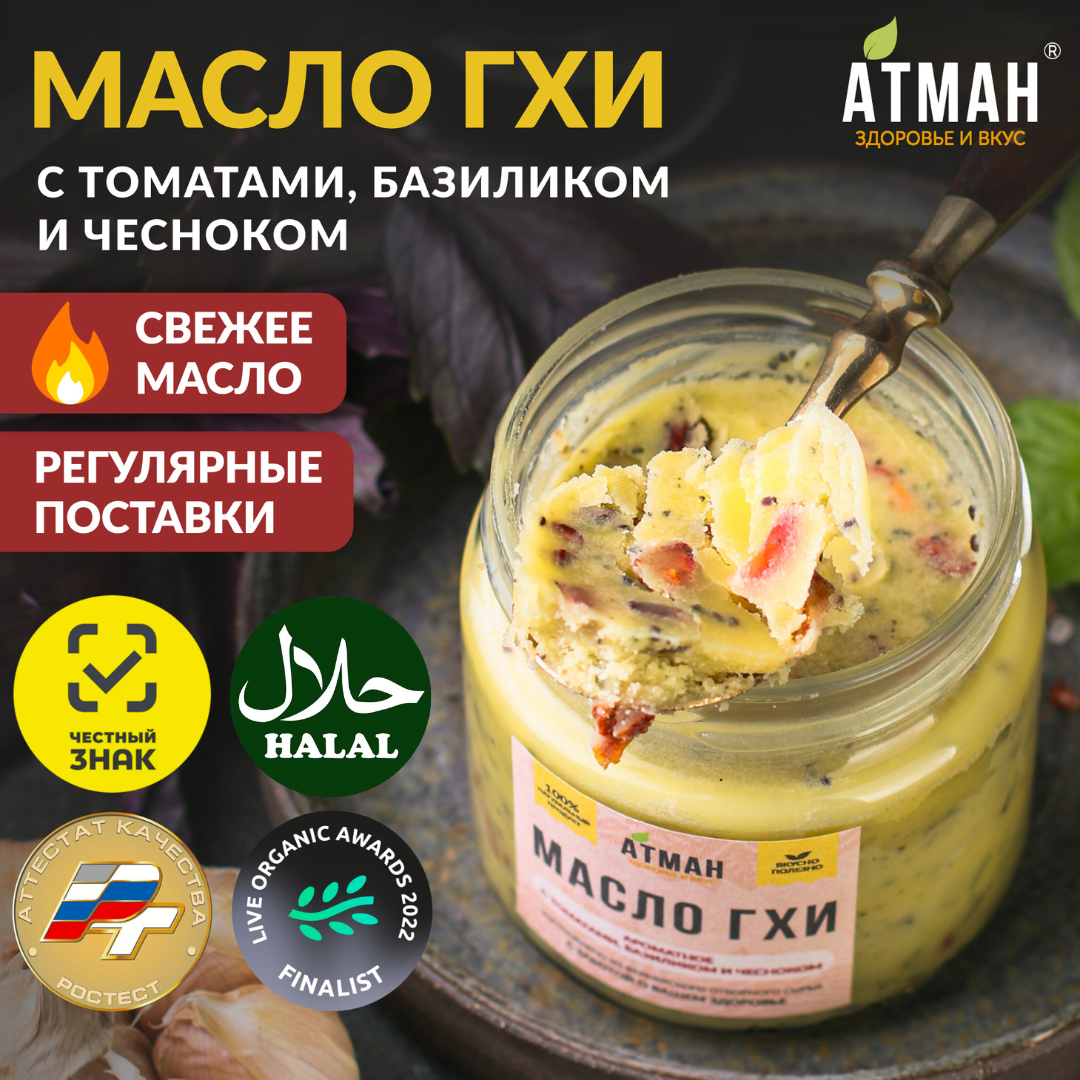 Масло ГХИ с томатом, базиликом, чесноком 99,7 %, 150 г, топленое, для жарки, кето, правильное питание, АТМАН интересное: