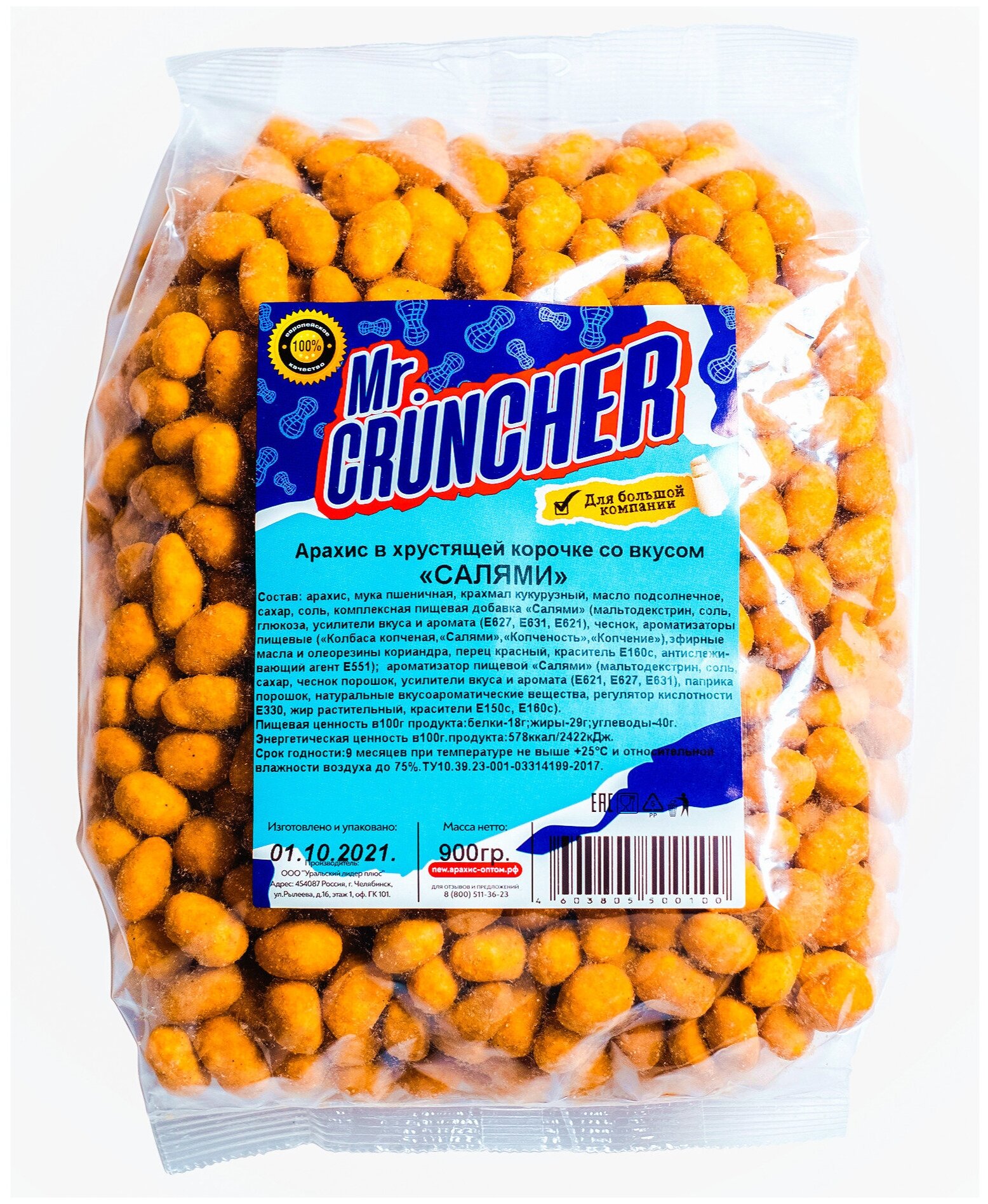 Арахис жареный соленый с хрустящей корочкой Mr. Cruncher в глазури к пиву со вкусом салями, 900 гр интересное: