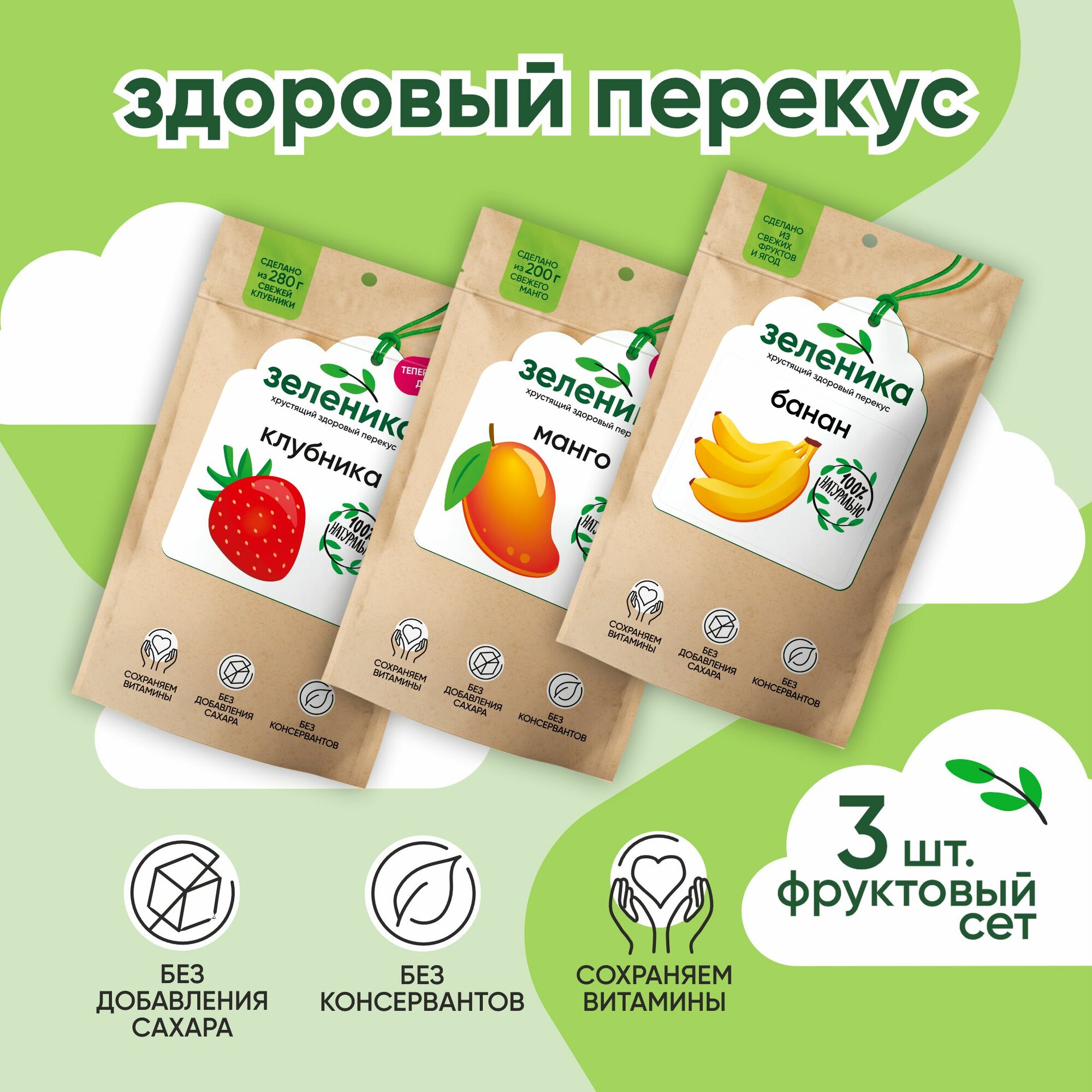 Набор фруктовых чипсов Зеленика / клубника, манго и банан / 3х20г интересное: