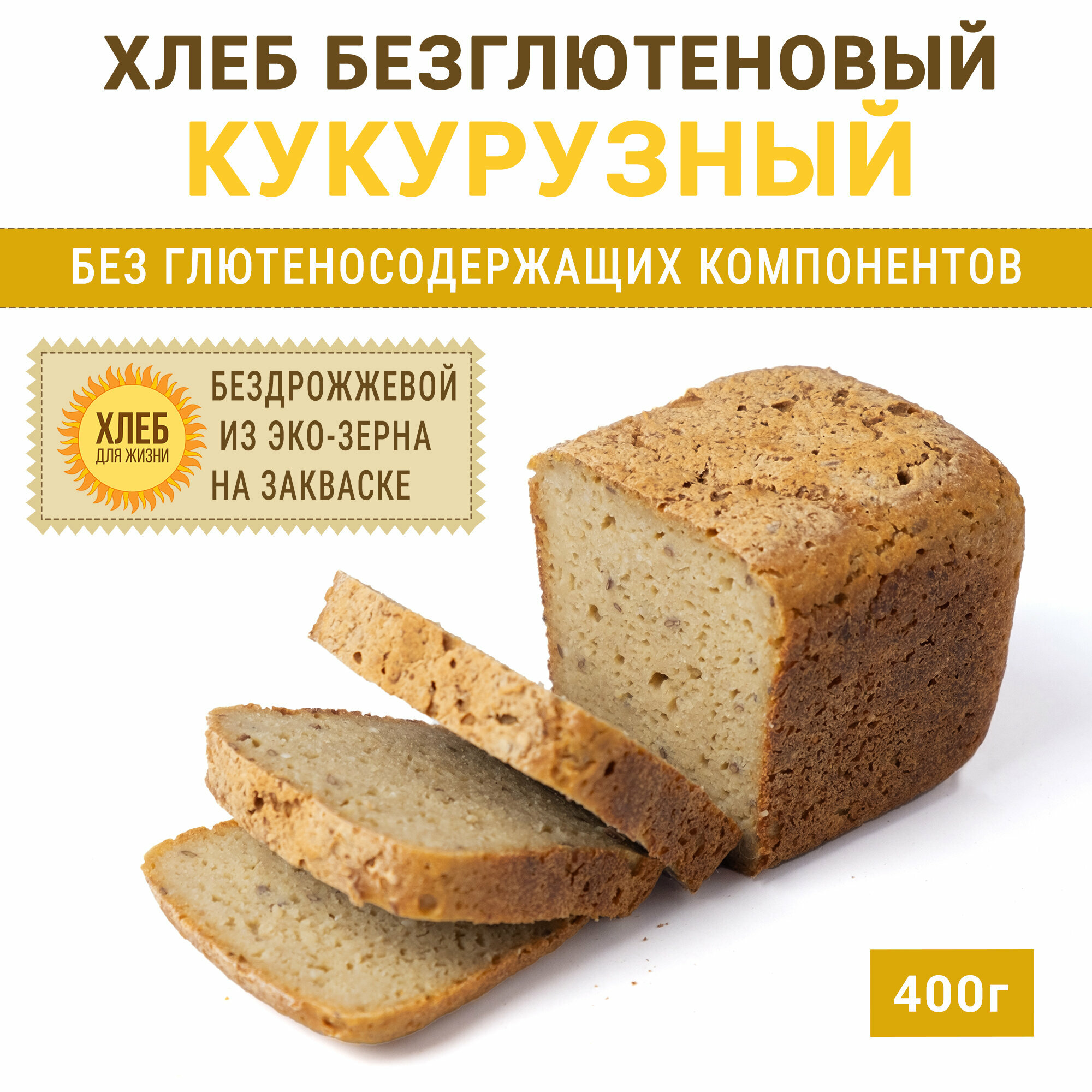 Купить (1х400г) Хлеб Кукурузный безглютеновый, цельнозерновой, бездрожжевой на закваске - Хлеб для Жизни