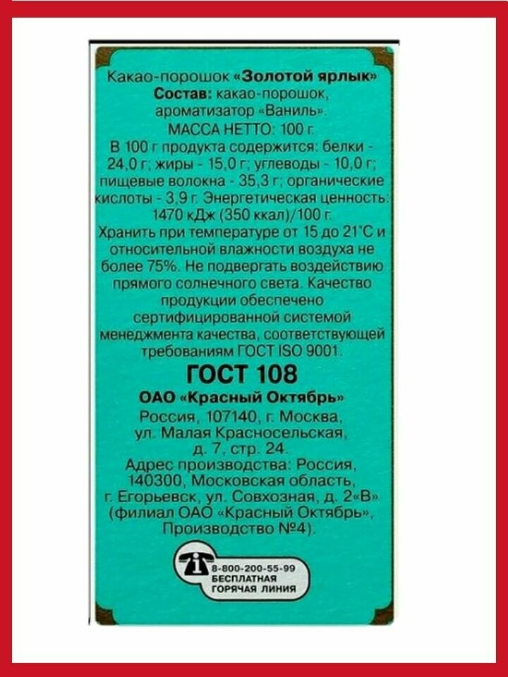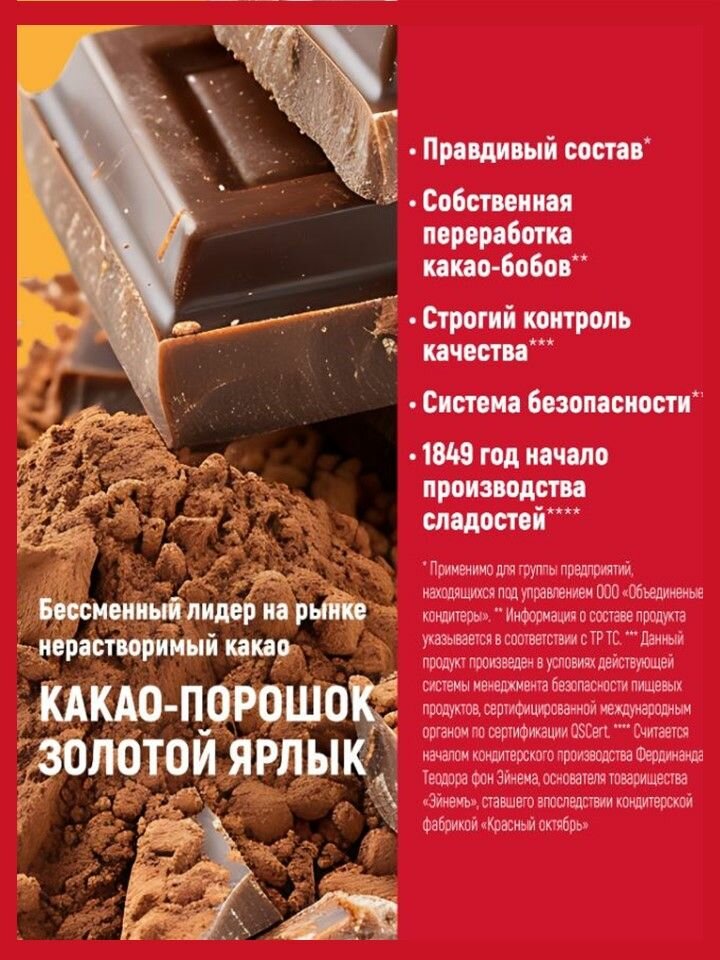 Какао-порошок Золотой Ярлык 4шт*100г для варки/Красный Октябрь/Россия интересное: