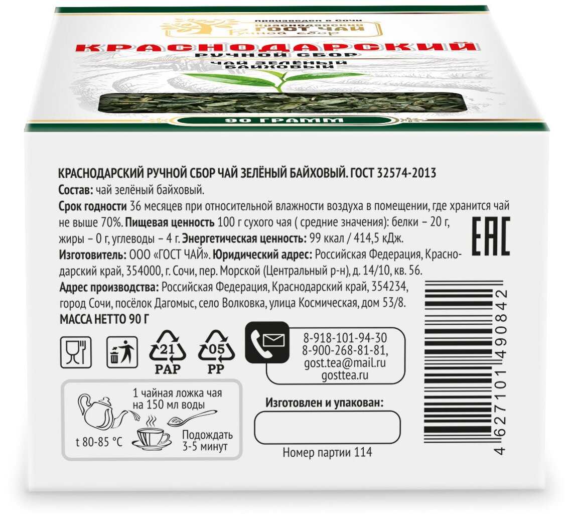 Купить Краснодарский чай ручной сбор 90г зеленый Отборный крупнолистовой крупнолистовой