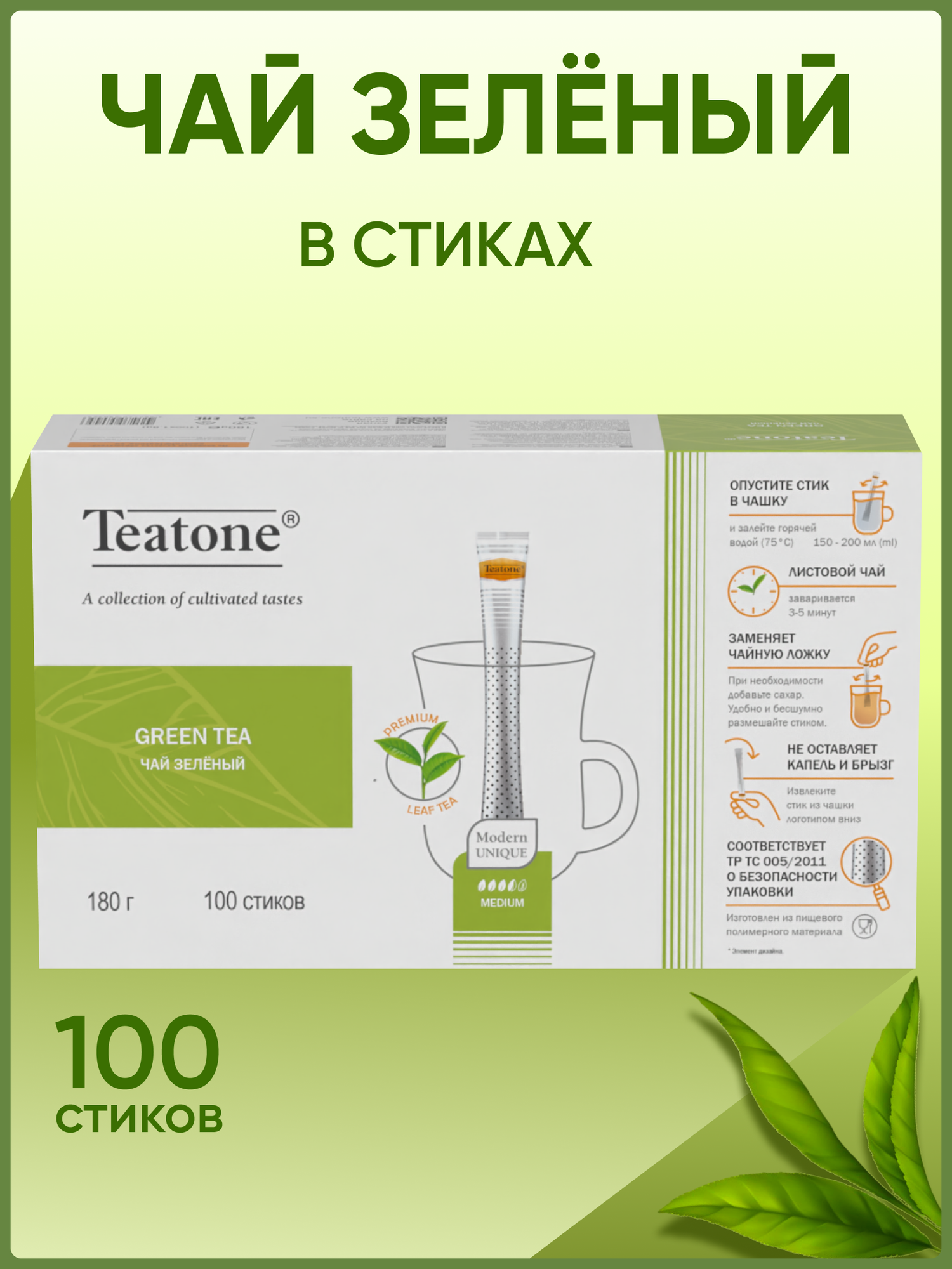 Чай зелёный, TEATONE, мелколистовой, в стиках, (100 стиков*1,8г) интересное: