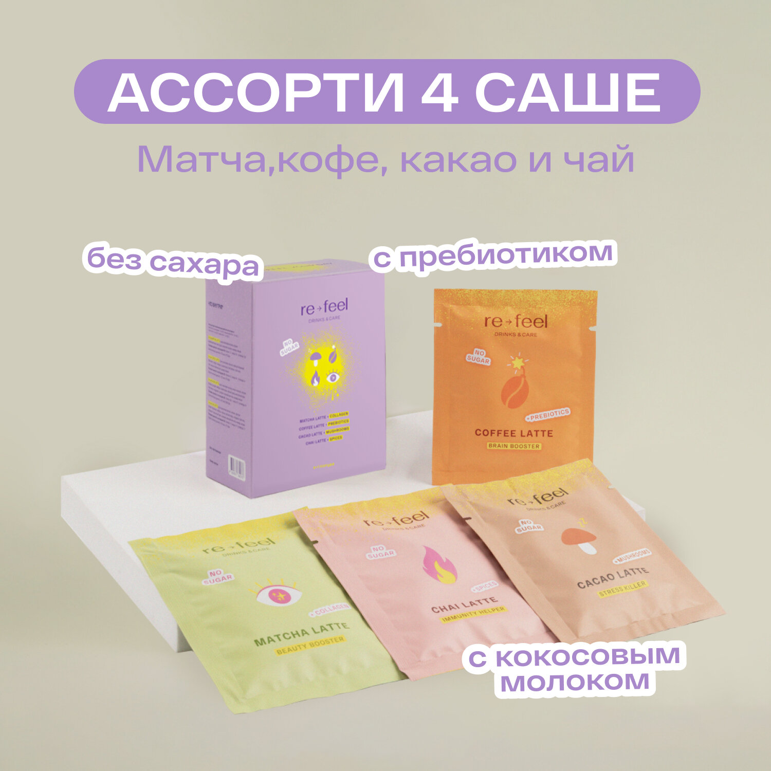 Ассорти набор напитков re-feel чай матча, чай масала, какао и кофе 4 саше интересное: