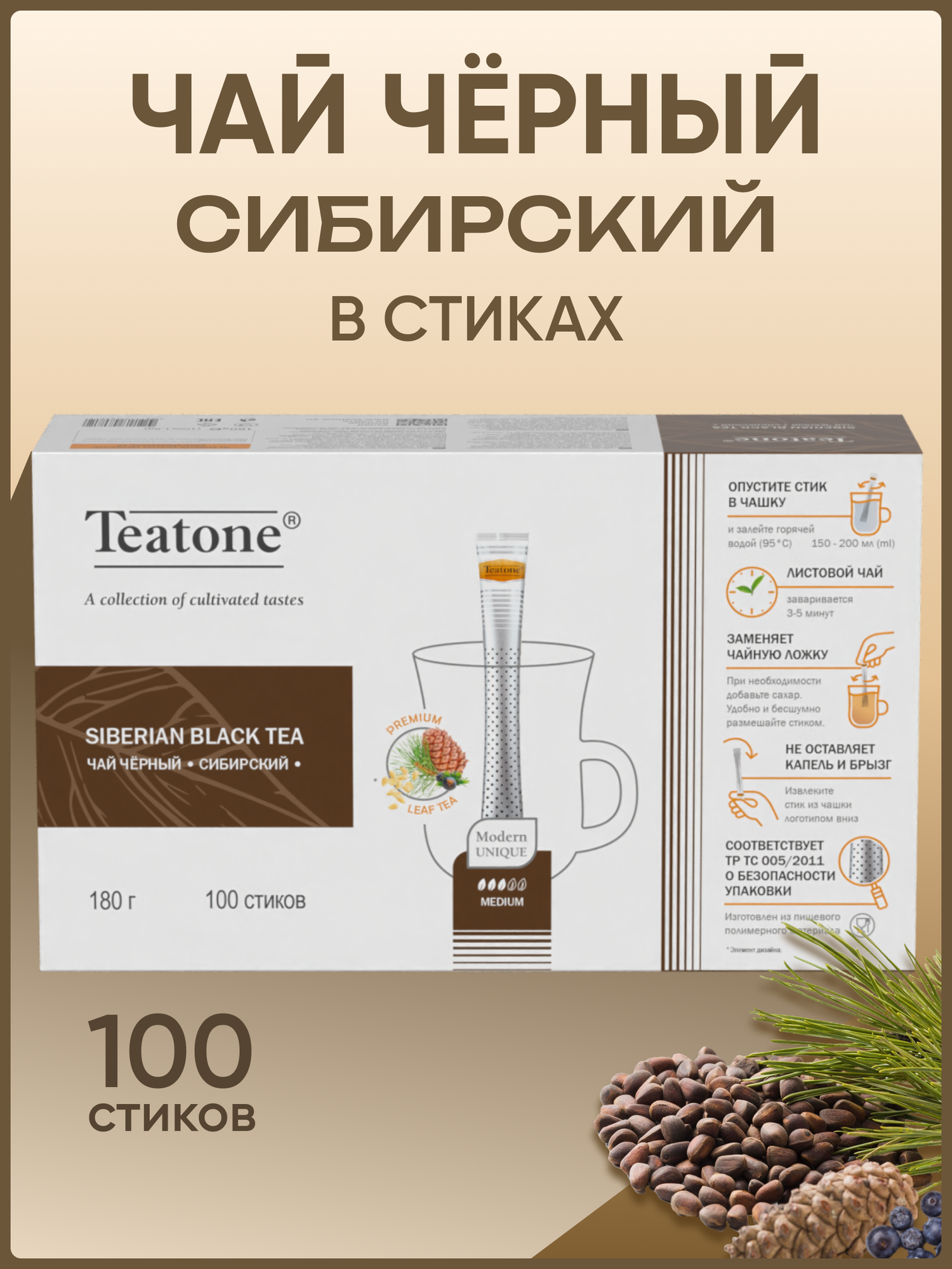 Чай чёрный с ароматом кедра и можжевельника «Сибирский», TEATONE в стиках, 100 шт* 1,8г интересное: