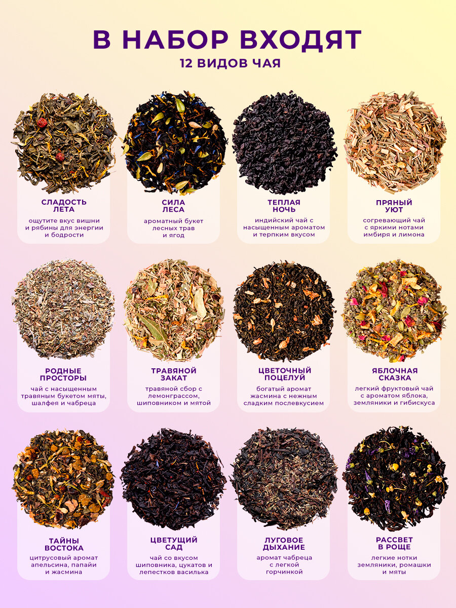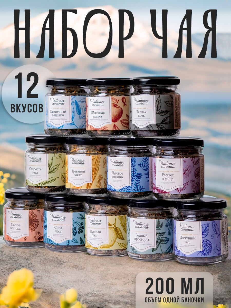 Чай листовой Чайная соната ассорти из 12 вкусов: черный, зеленый, подарочный набор, подарок женщине на 8 марта интересное: