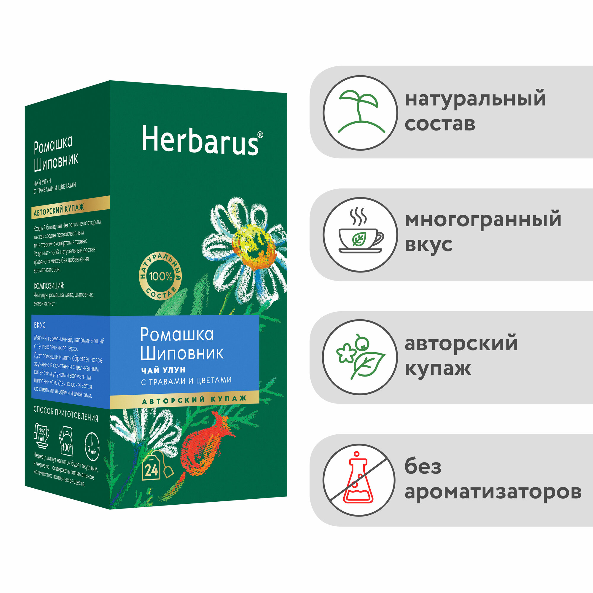 Ниже Вы можете прочитать отзывы на Чай улун с добавками в пакетиках Herbarus "Ромашка Шиповник", 24 шт., ознакомится с подробными характеристиками, посмотреть интересные обзоры и фотографии на Чай улун с добавками в пакетиках Herbarus "Ромашка Шиповник", 24 шт..
