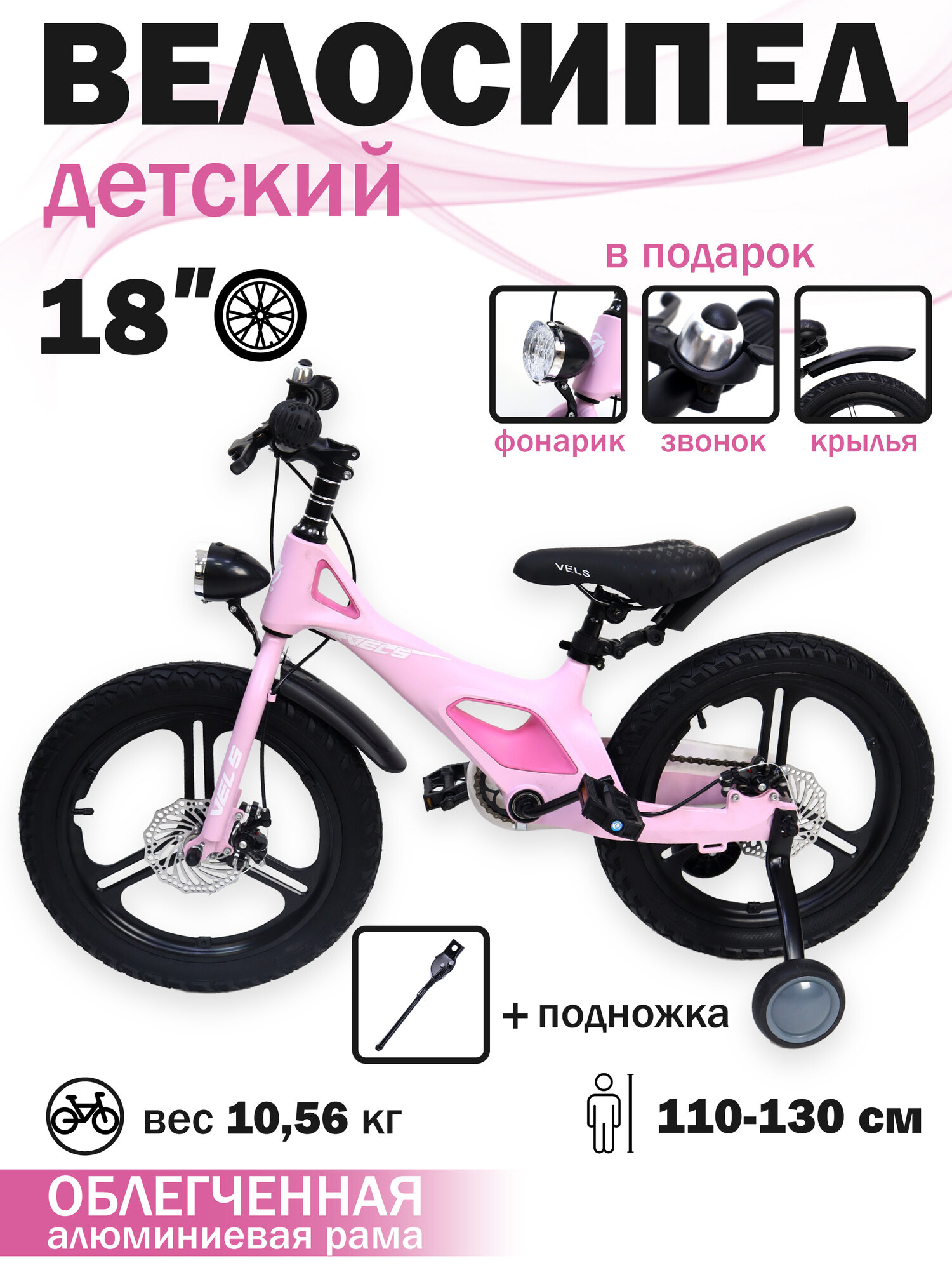 Купить Детский велосипед VELS, 18", розовый, с боковыми колесами, для девочек, алюминиевый сплав, дисковый тормоз