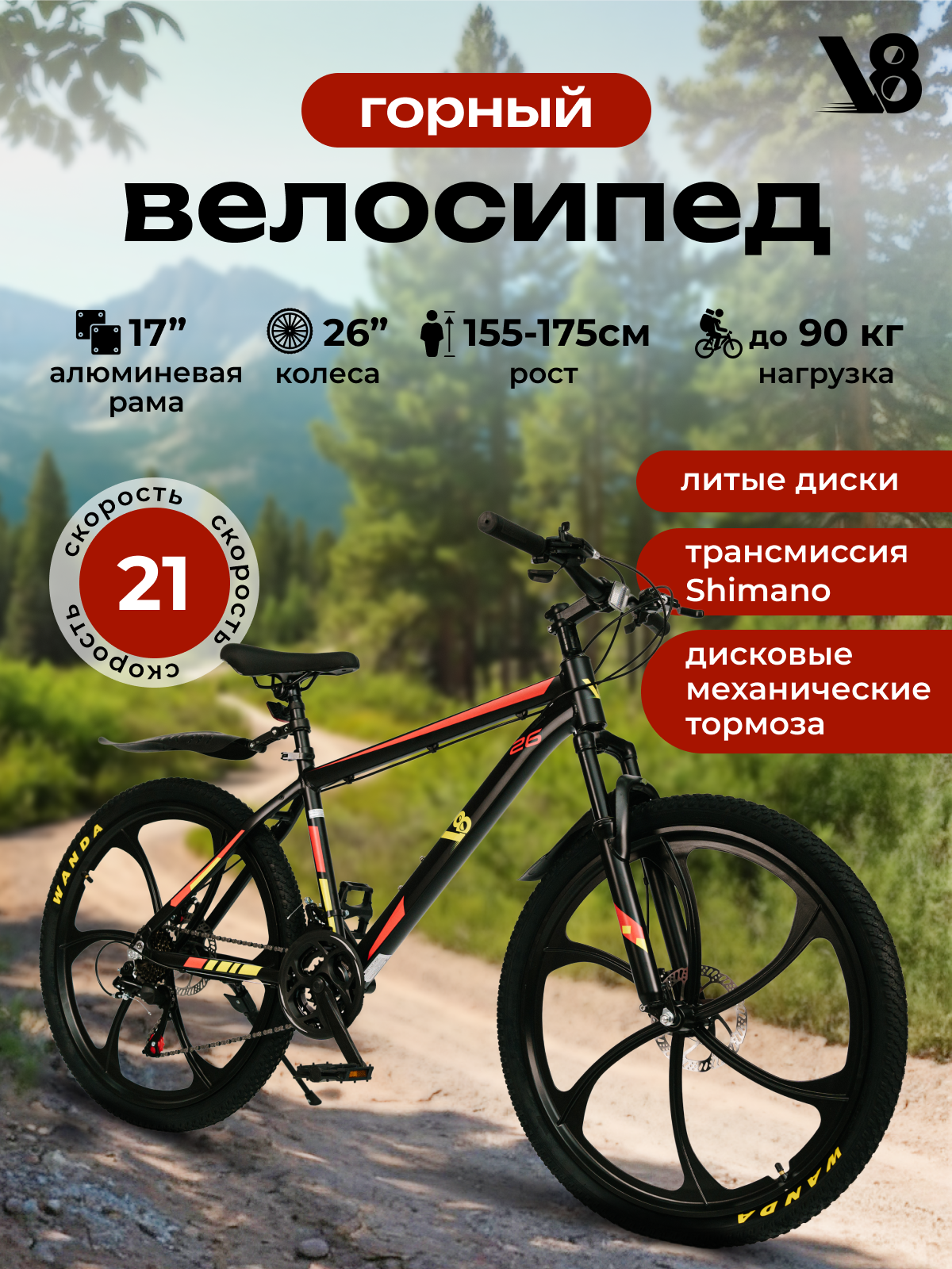 Велосипед горный для взрослых V8 V-M2647R 26", литые диски, черный, красный, рама 17", 21 скорость интересное: