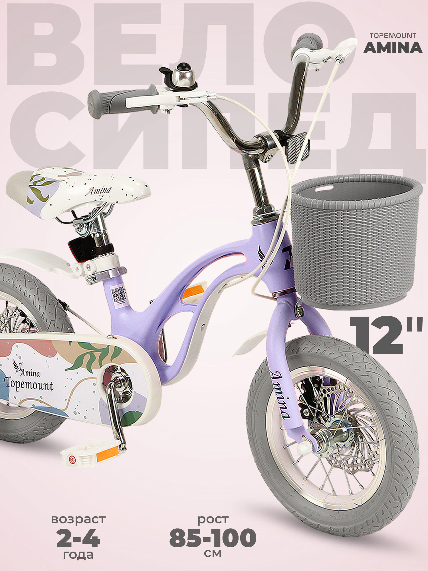 Купить Велосипед детский TOPEMOUNT "Amina" 12, магниевая рама, дисковые тормоза, корзинка, фиолетовый