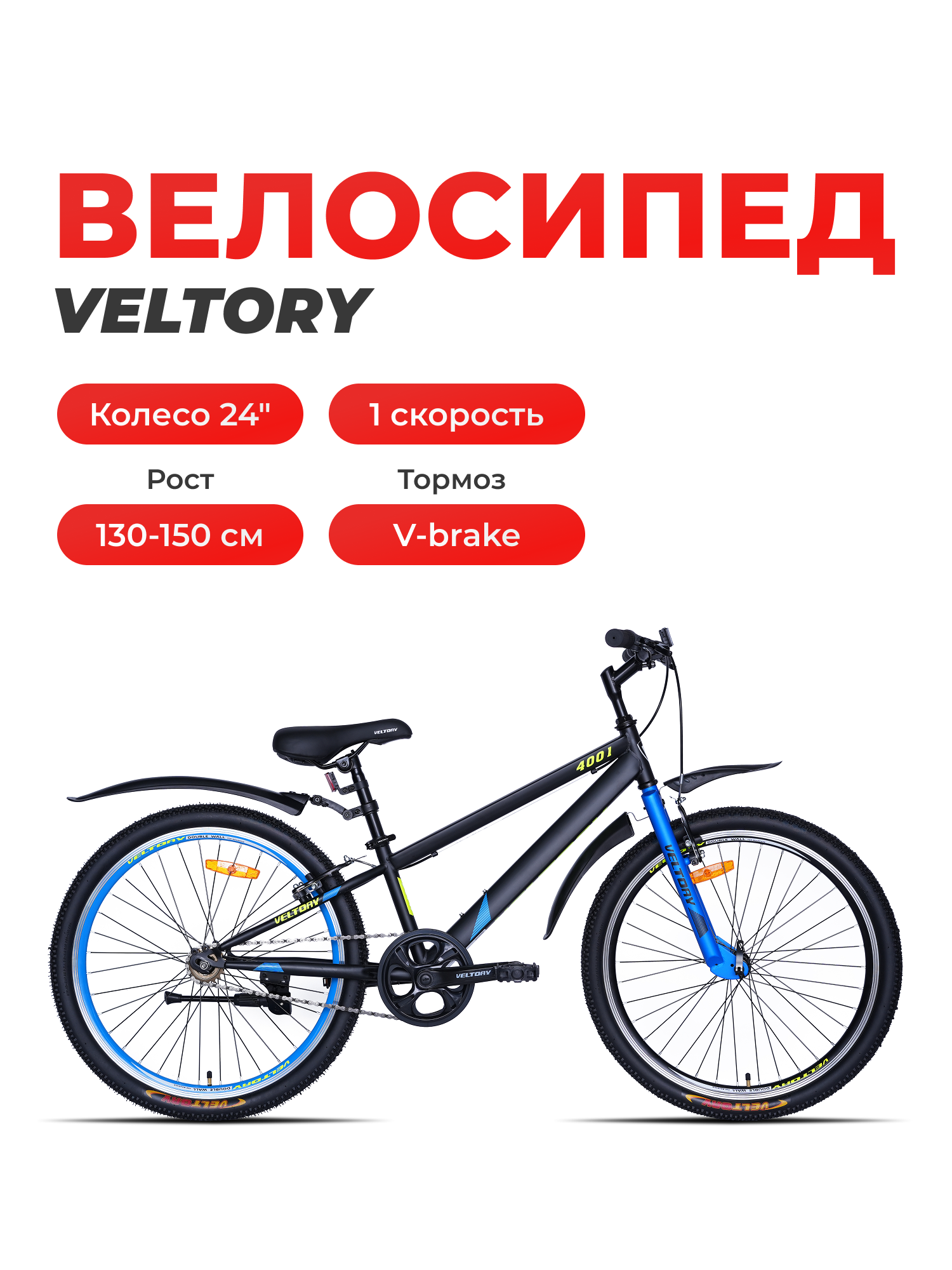 Купить Велосипед VELTORY 4001, горный, черный, для девочек/мальчиков, рама 11,5", рост 130-150, 24"